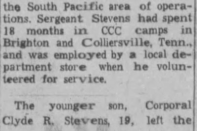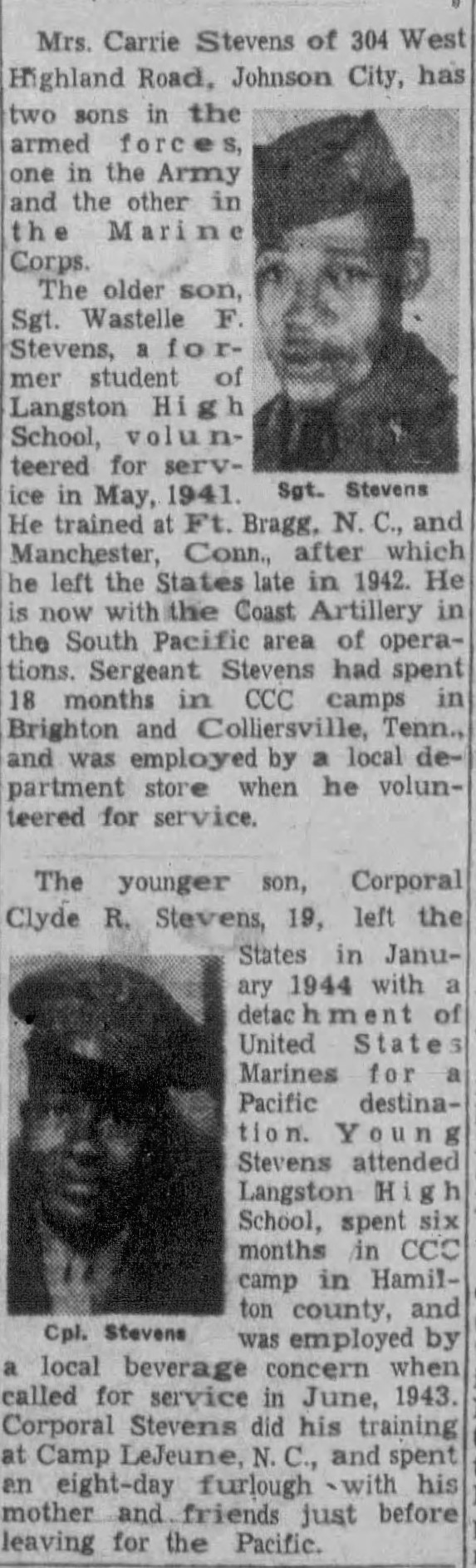 Mrs. Carrie Stevens of 304 West Highland Road, Johnson City, has two sons in the armed forces, one in the Army and the other in the Marine Corps. The older son, Wastelle F. Stevens, a former student of Langston High School, volunteered for service in May, 1941. He trained at Ft. Bragg, N.C., and Manchester, Conn., after which he left the States late in 1942. He is now with the Coast Artillery in the South Pacific area of operations. Sergeant Stevens had spent 18 months in CCC Camps in Brighton and Collierville, Tenn., and was employed by a local department store when he volunteered for service. The younger son, Corporal Clyde R. Stevens, 19, left the States in January 1944 with a detachment of United States Marines for a Pacific destination. Young Stevens attended Langston High School, spent six months in CCC camp in Hamilton County, and was employed by a local beverage concern when called for service in June, 1943. Corporal Stevens did his training at Camp LeJeune, N.C., and spent an eight-day furlough with his mother and friends just before leaving for the Pacific.