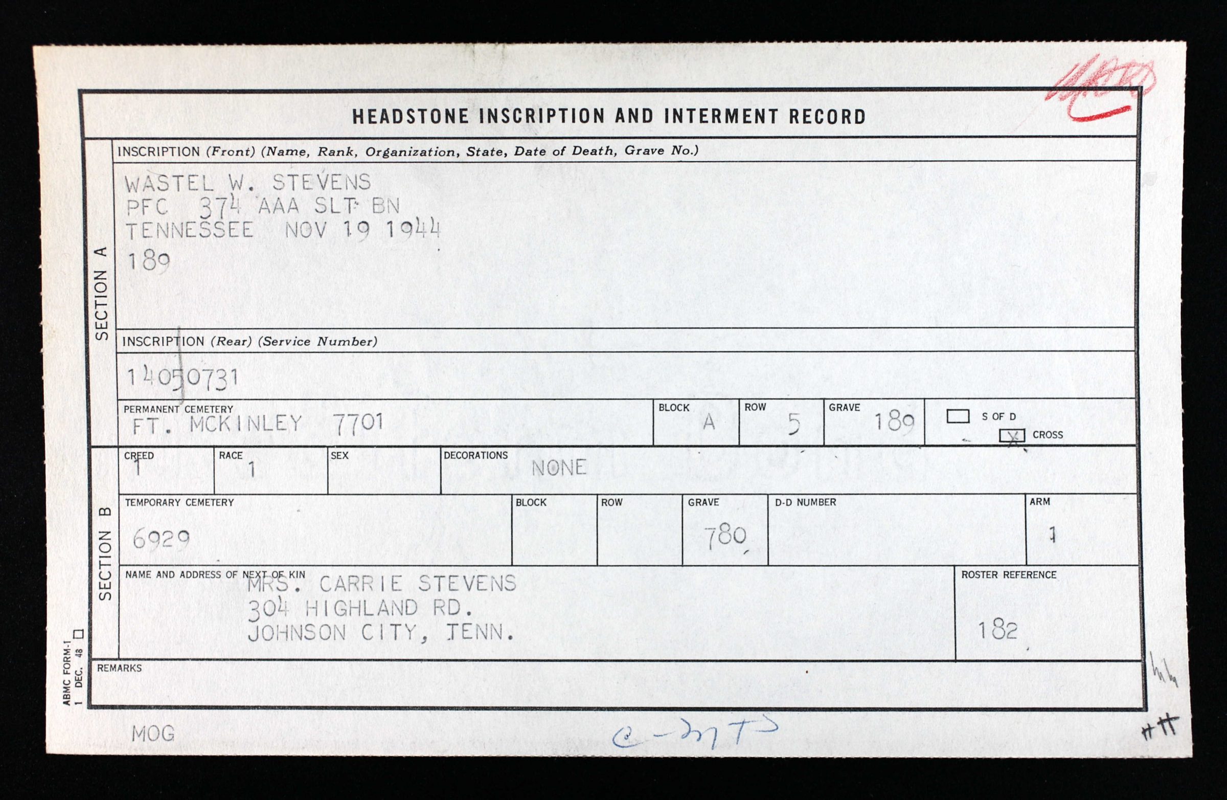 Wastel William Stevens was born in 1922 in Tennessee, the son of George Stevens and Carrie Estelle Young. He had one brother, Clyde Russell Stevens, and one sister, Sarah Frances Stevens. He was initially assigned to the 77th Coast Artillery at Fort Bragg, near Fayetteville, N.C. and later assigned to the 374th Anti-Aircraft Artillery Searchlight Battalion.