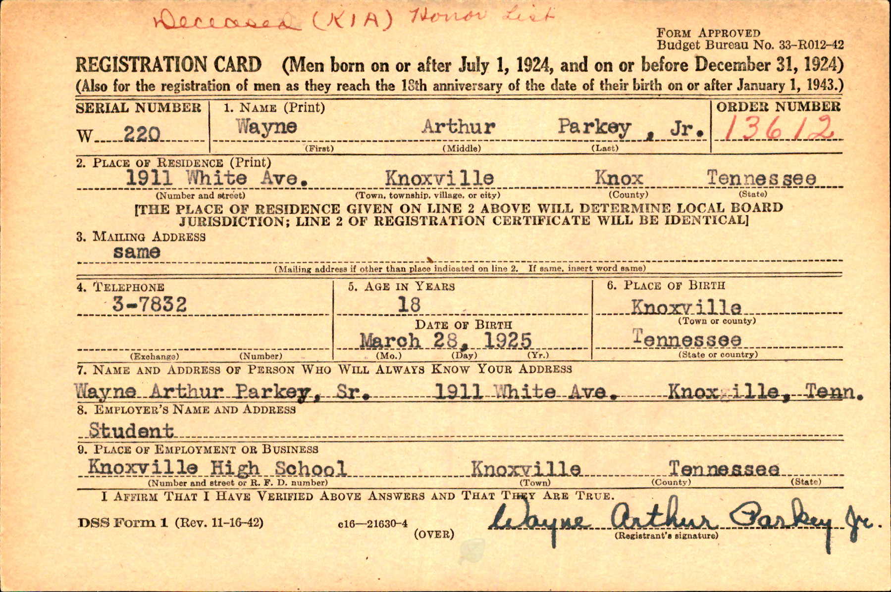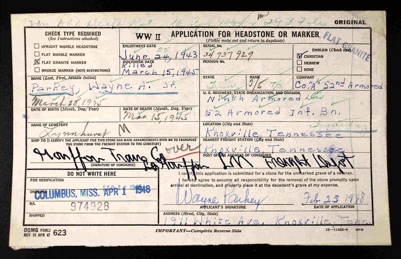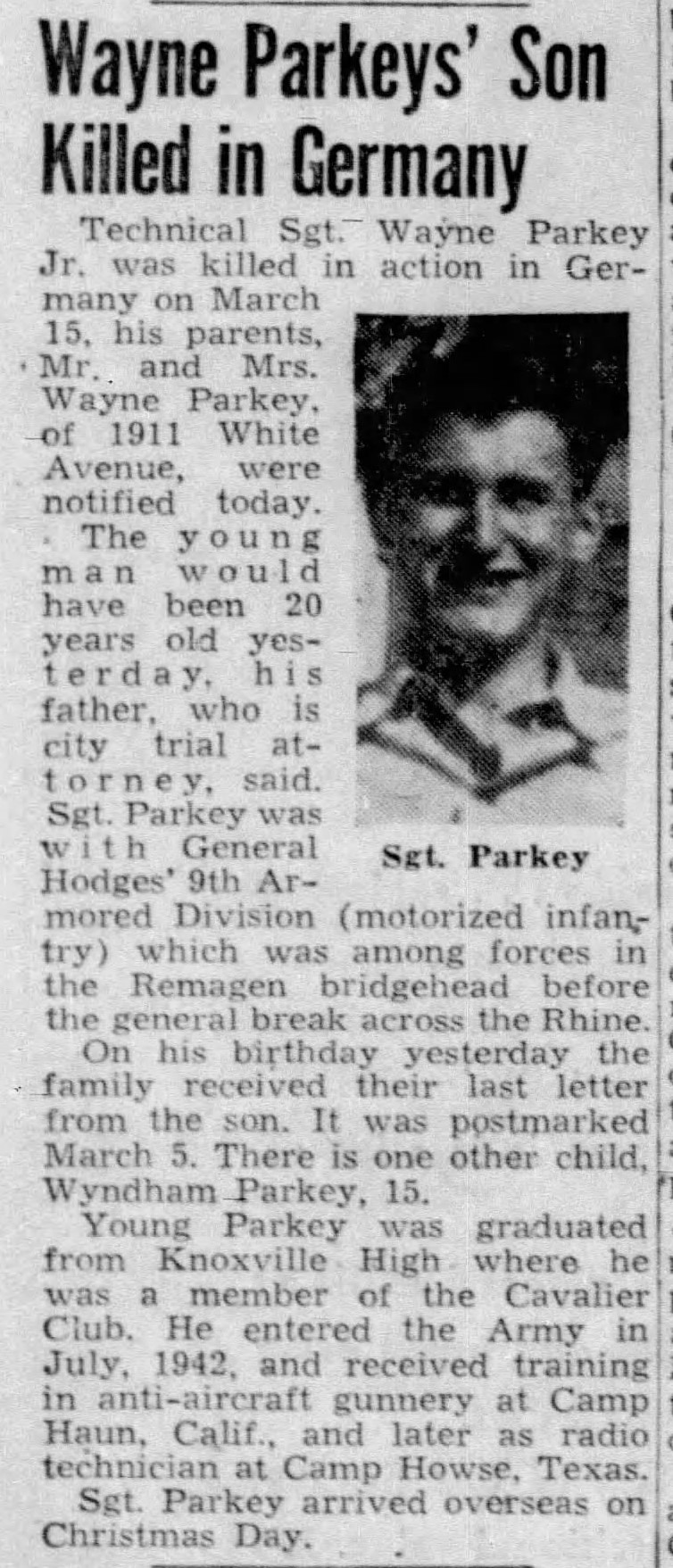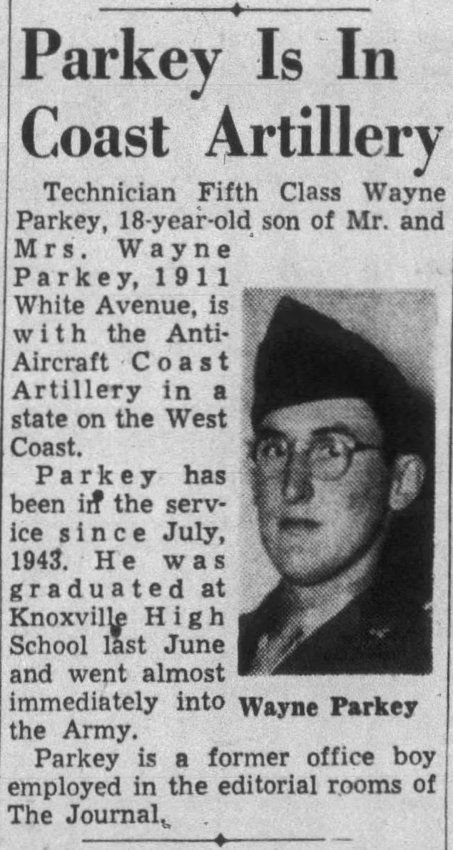 Wayne Arthur Parkey was born on 28 March 1925 to Wayne Arthur Parkey and Ariana Long. He graduated at Knoxville High School and enlisted on June 25, 1943, in Fort Oglethorpe, GA. T5 Parkey was Killed in Action 15 March 1945 in Germany.