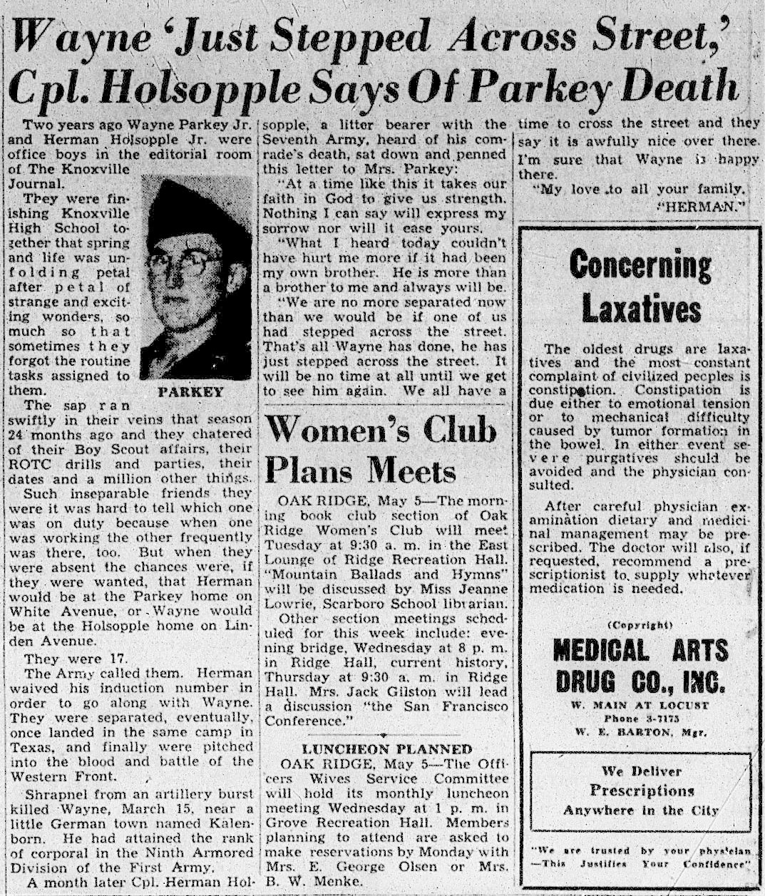 The Army called them. Herman waived his induction number in order to go along with Wayne. They were separated, eventually, once landed in the same camp in Texas, and finally were pitched into the blood and battle of the Western Front. Shrapnel from an artillery burst killed Wayne, March 15, near a little German town named Kalenborn. He had attained the rank of corporal in the Ninth Armored Division of the First Army. A month later Cpl. Herman Holsopple, a litter bearer with the Seventh Army, heard of his comrade’s death, sat down and penned this letter to Mrs. Parkey: