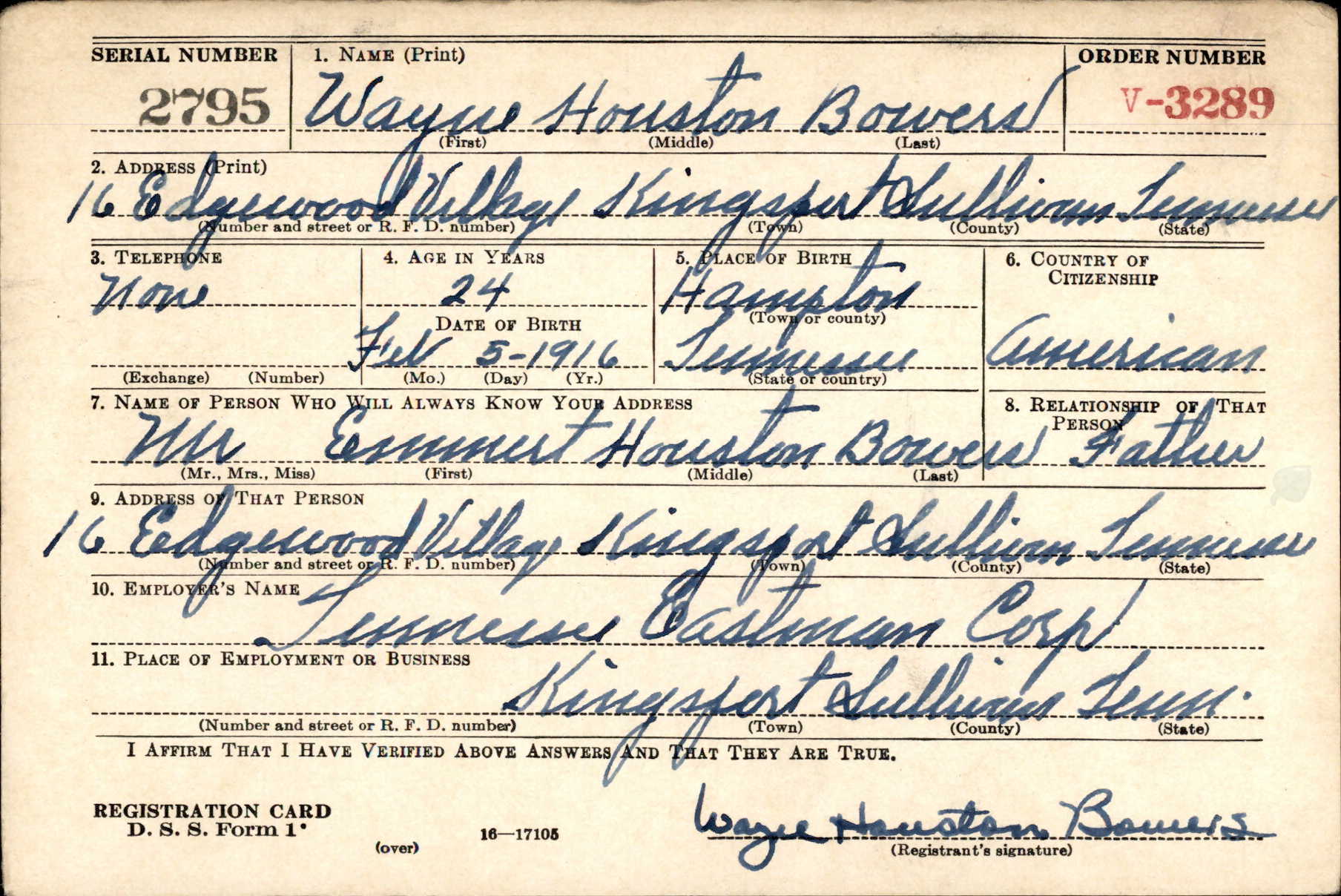 Wayne Houston Bowers was born in Hampton, Tennessee, the son of Emmert Houston Bowers and Celia Isabella Peters.