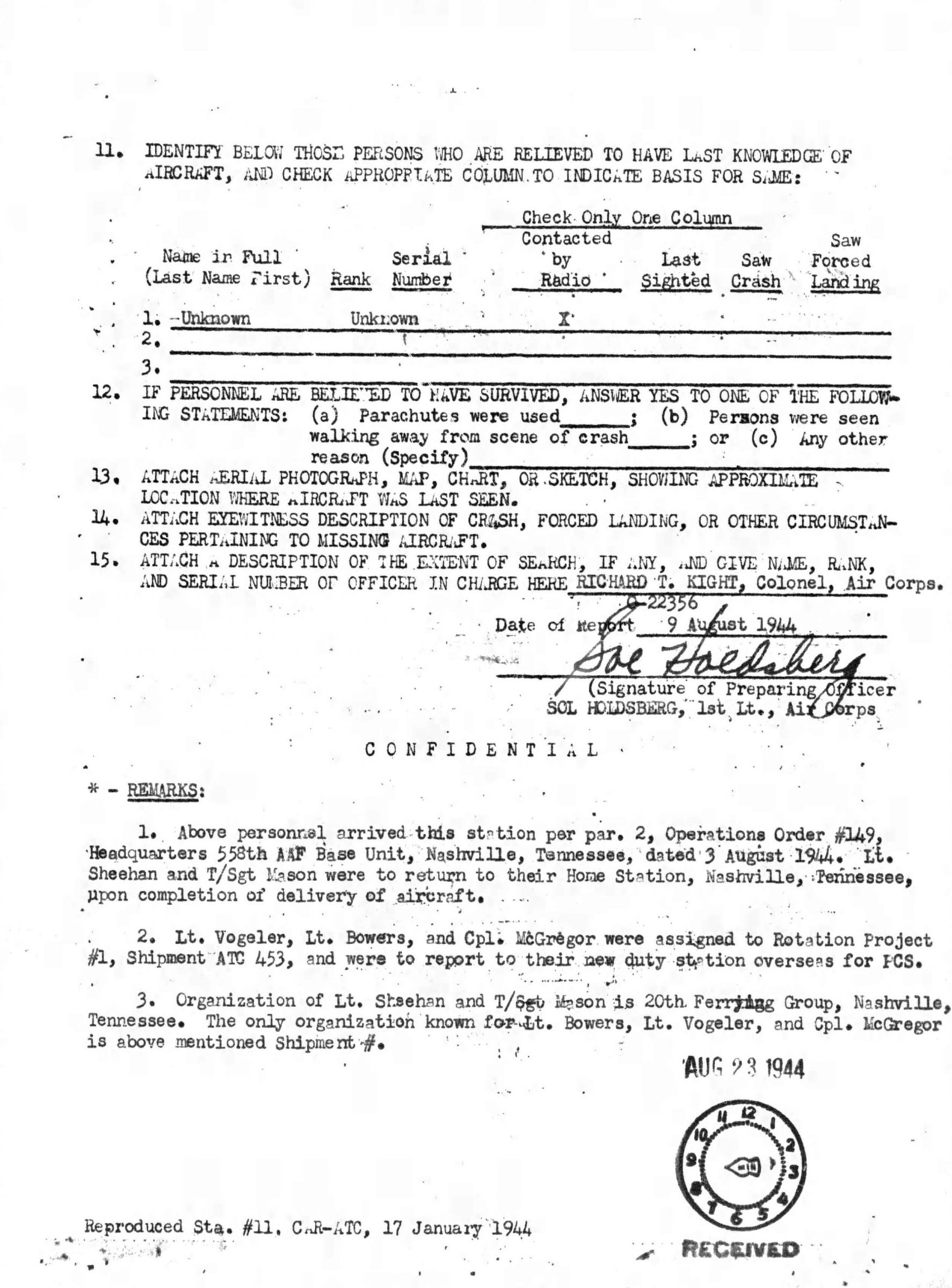 Aircraft B-25H with serial number 43-5068 departed Borinquen, P.R. on a ferry mission to Waller Field, Trinidad and failed to arrive at destination. Whereabouts of aircraft or crew is unknown. The crewmembers arrived at the station per par. 2, Operations Order #149, Headquarters 558th AAF Base Unit, Nashville, Tennessee, dated 3 August 1944. Lt. Sheehan and T/Sgt Mason were to return to their Home station, Nashville, Tennessee, upon completion of delivery of aircraft. Lt. Vogeler, Lt. Bowers and Cpl McGregor were assigned to Rotation Project #1. Shipment ATC 453, and were to report to their new duty station overseas for PCS: Organization of Lt. Sheehan and T/Sgt Mason is 20th Ferrying Group, Nashville, Tennessee. The only organization known for Lt. Bowers, Lt. Vogeler, and Cpl. McGregor is above mentioned Shipment #.