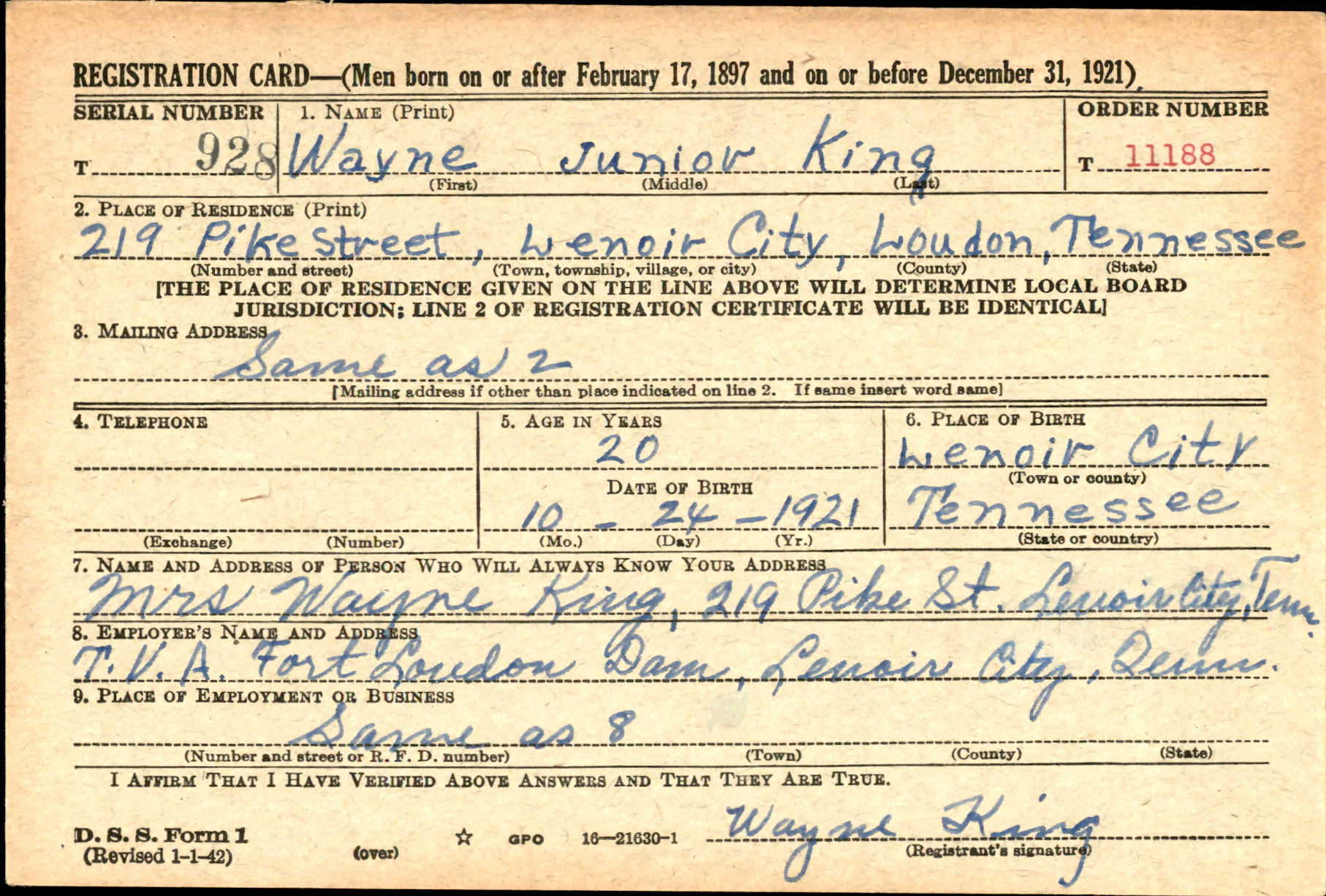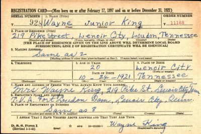 Wife: Mrs. Wayne J. King, 219 Pike Street, Lenoir City, TN