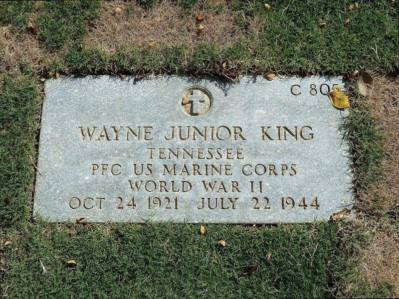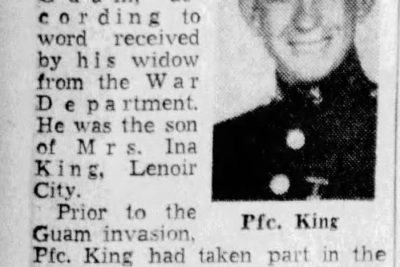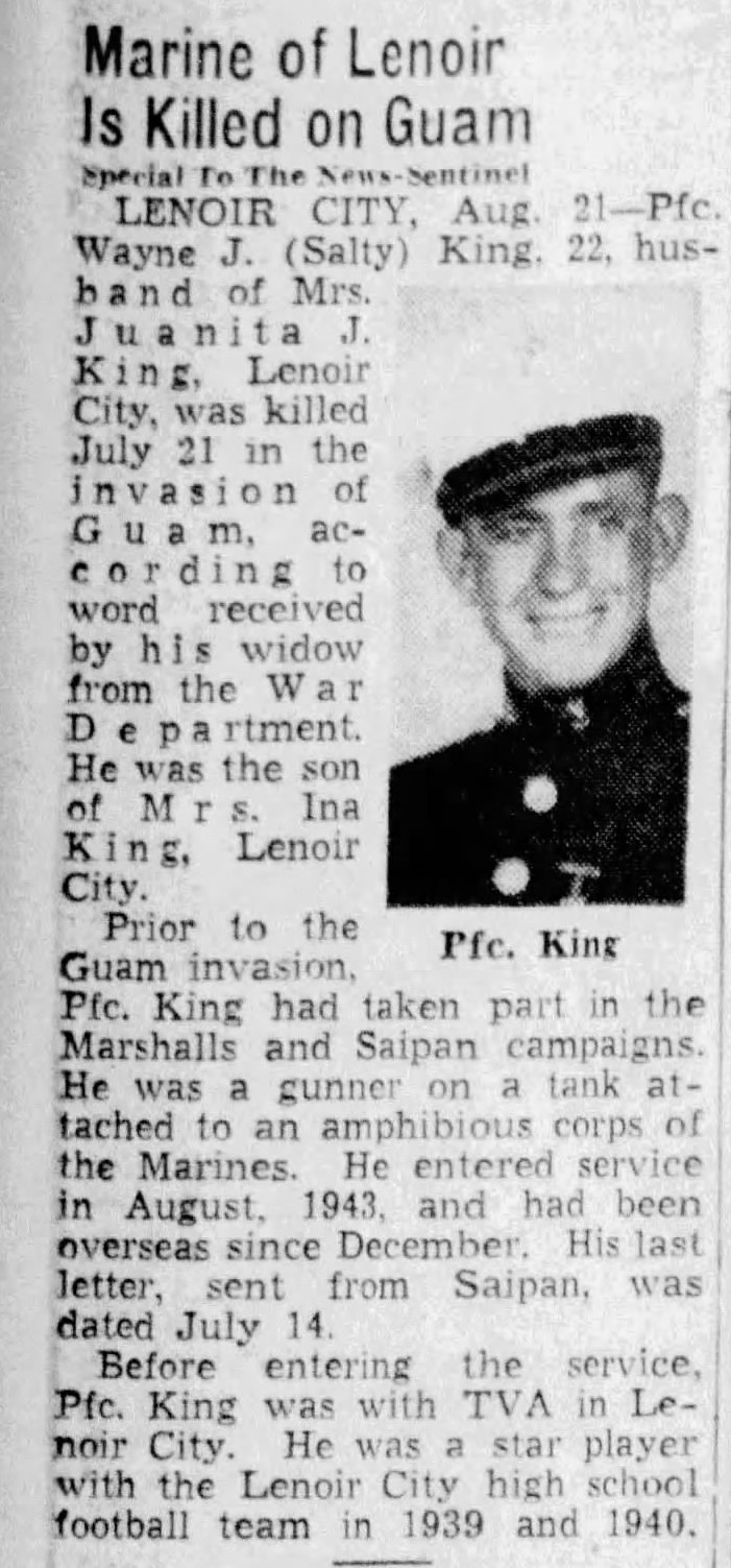 Pfc. Wayne J. (Salty) King, 22, husband of Mrs. Juanita J. King, Lenoir City, was killed July 21 in the invasion of Guam, according to word received by his widow from the War Department, He was the son of Mrs. Ina King, Lenoir City. Prior to the Guam invasion, Pfc. King had taken part in the Marshalls and Saipan campaigns. He was a gunner on a tank attached to an amphibious corps of the Marines. He entered service in August, 1943, and had been overseas since December. His last letter, sent from Saipan, was dated July 14. Before entering the service, Pfc. King was with TVA in Lenoir City. He was a star player with the Lenoir City high school football team in 1939-1940.