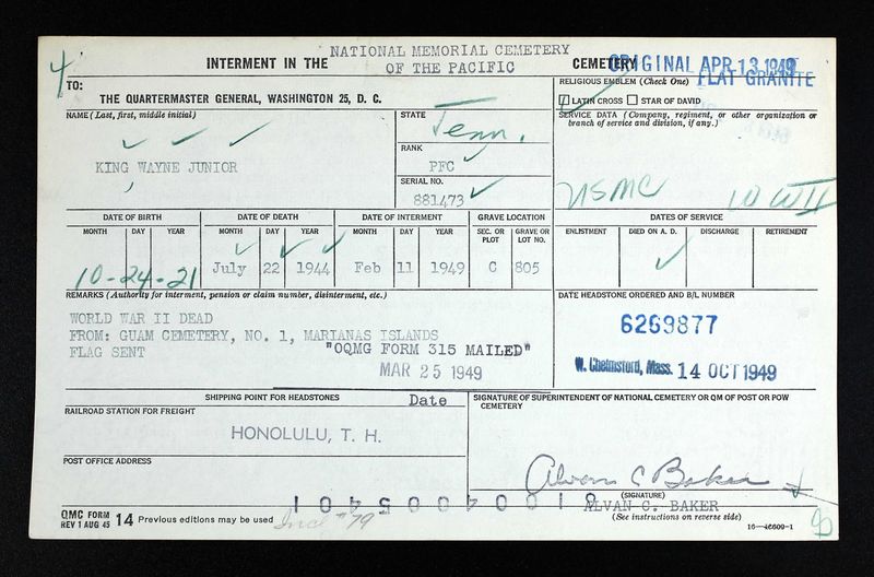 PFC King was initially buried at Guam Cemetery, No. 1, Marianas Islands.