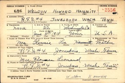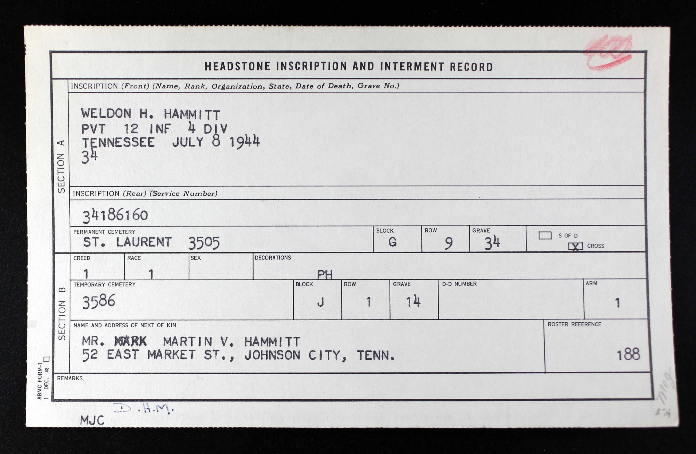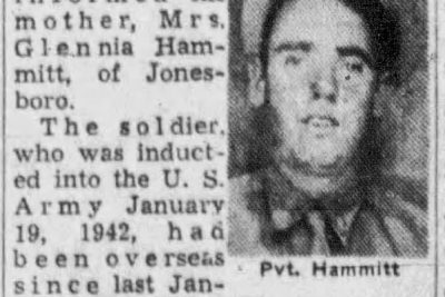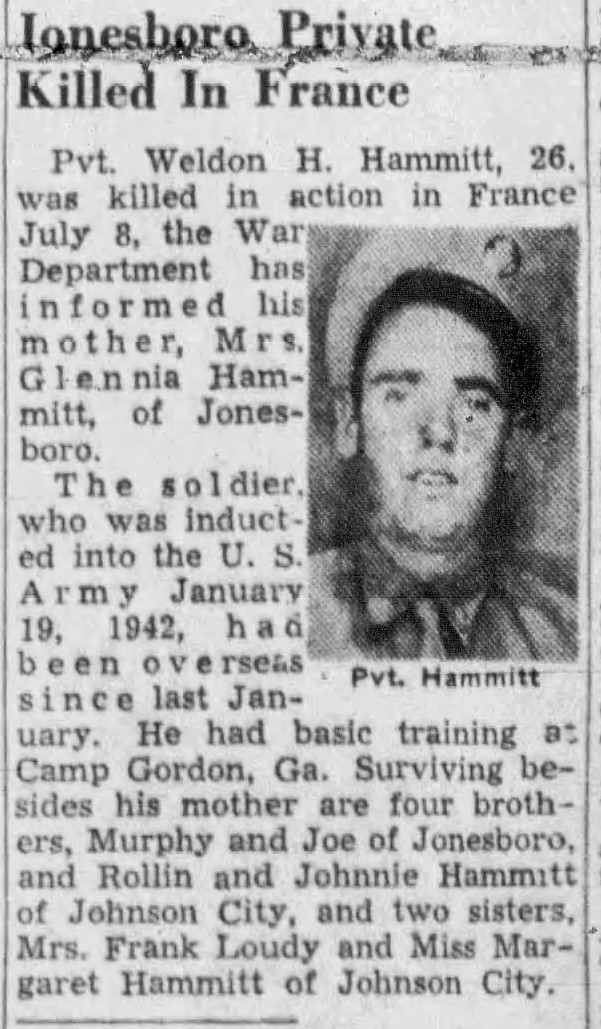 Pvt. Weldon H. Hammitt, 26, was killed in action in France July 8, the War Department has informed his mother, Mrs. Glennia Hammitt, of Jonesboro. The soldier, who was inducted into the U.S. Army January 19, 1942, had been overseas since last January. He had basic training at Camp Gordon, Ga. Surviving besides his mother are four brothers, Murphy and Joe of Jonesboro, and Rollin and Johnnie Hammitt of Johnson City, and two sisters, Mrs. Frank Loudy and Miss Margaret Hammitt of Johnson City.