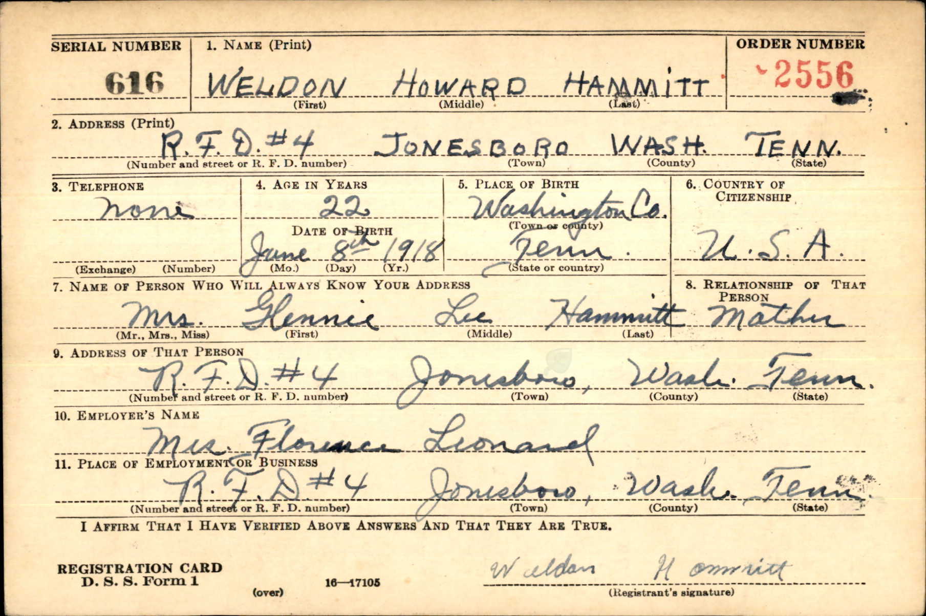 Weldon Howard Hammitt was born in Boones Creek, Washington County, Tennessee, the son of Martin Van Buren Hammett and Martha Glenna Lee.