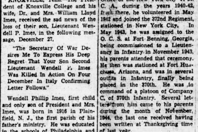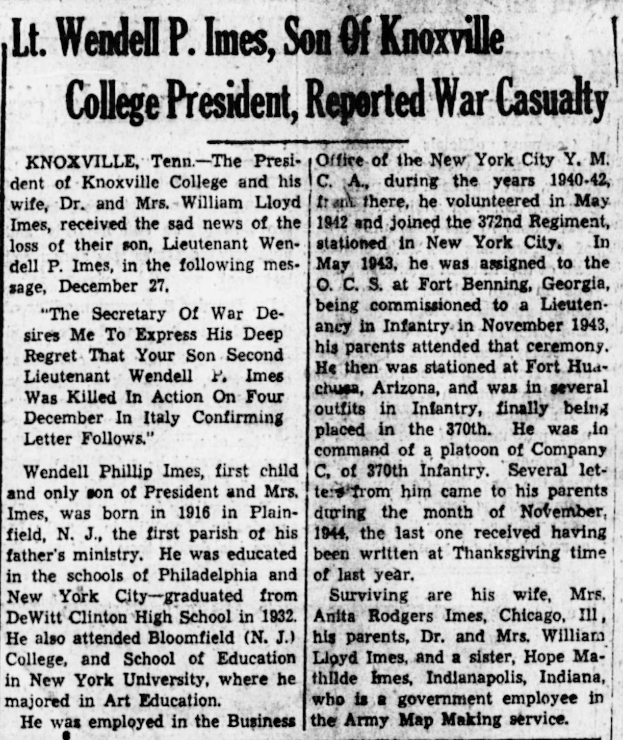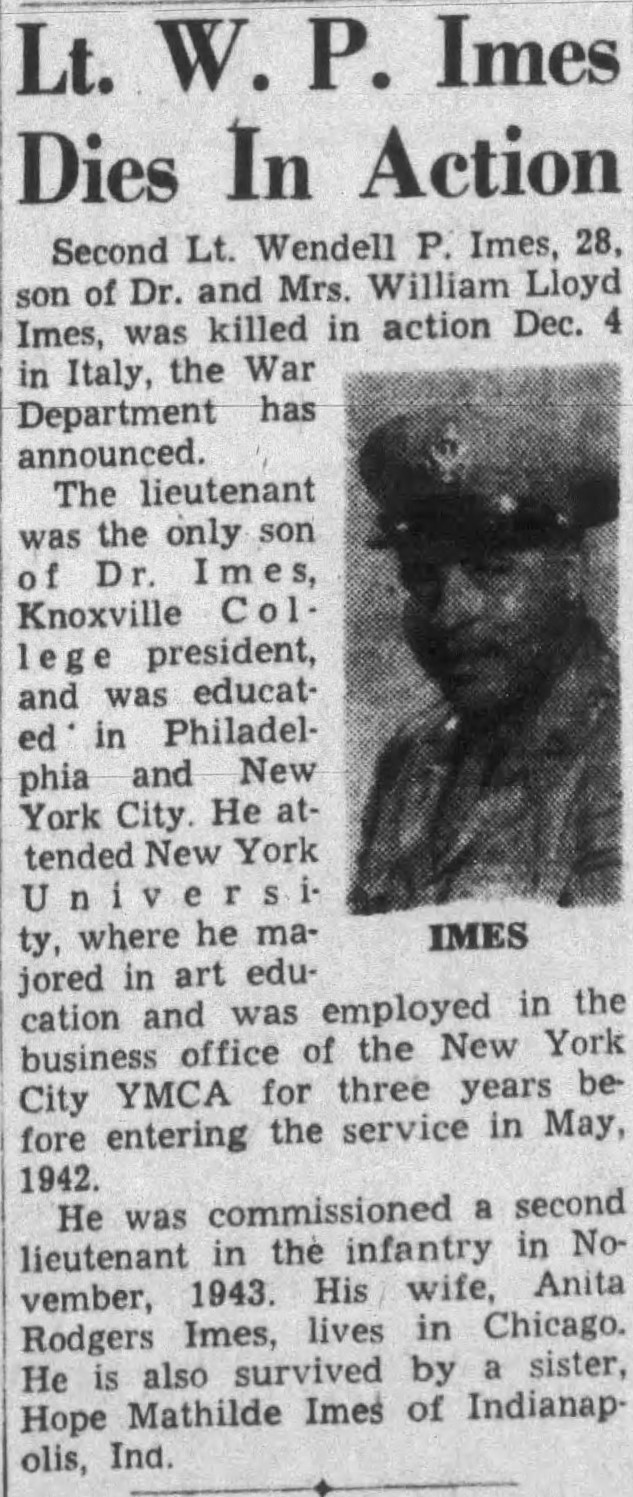 Second Lt. Wendell P. Imes, 28, son of Dr. And Mrs. William Lloyd Imes, was killed in action Dec. 4 in Italy, the War Department has announced. The Lieutenant was the only son of Dr. Imes, Knoxville College president, and was educated in Philadelphia and New York City. He attended New York University, where he majored in art education and was employed in the business office of the New York City YMCA for three years before entering the service in May, 1942. He was commissioned a second lieutenant in the infantry in November, 1943. His wife, Anita Rodgers Imes, lives in Chicago. He is also survived by a sister, Hope Mathilde Imes of Indianapolis, Ind.
