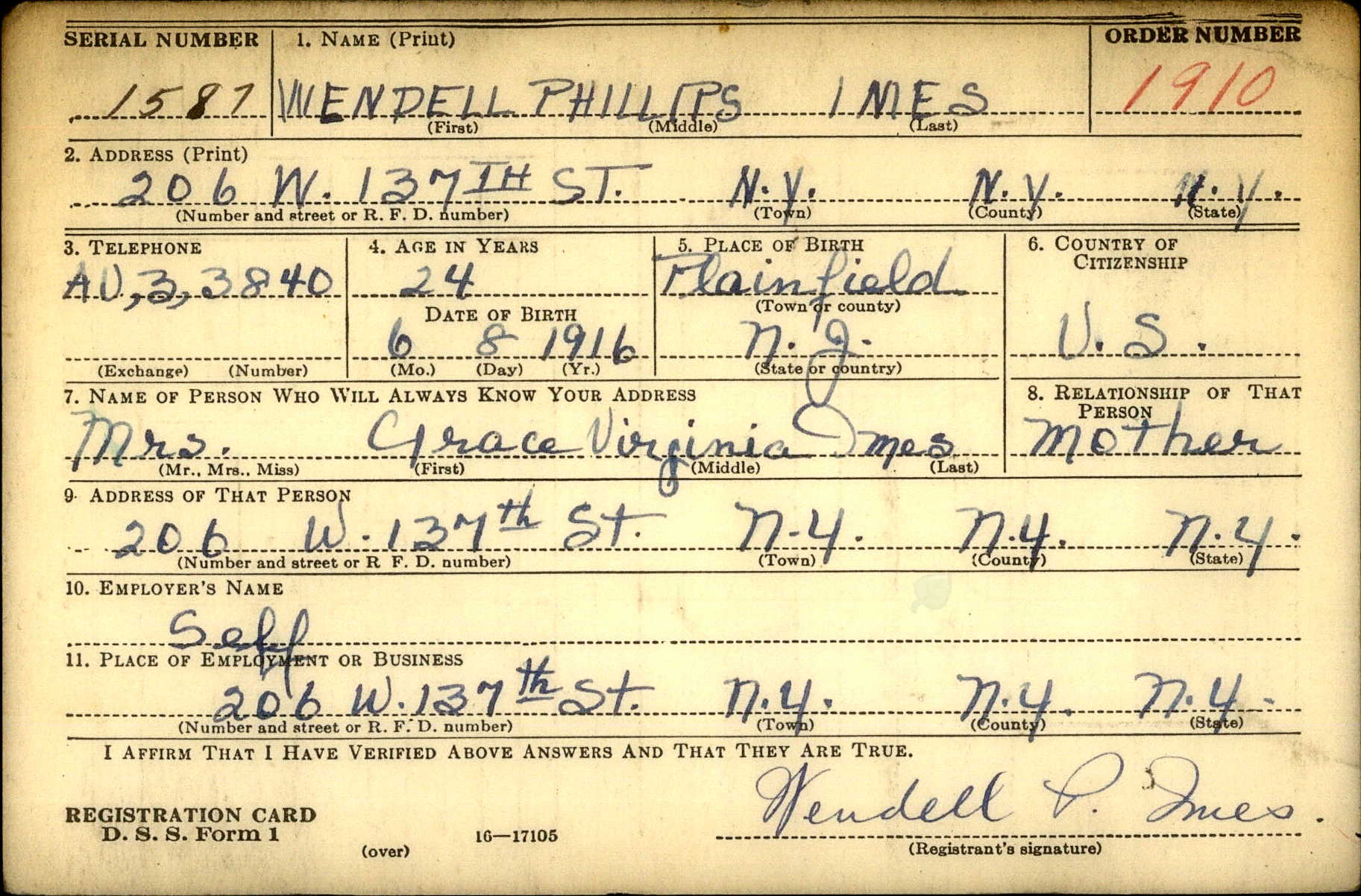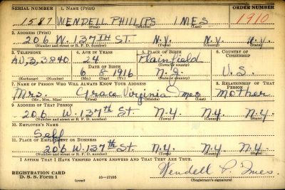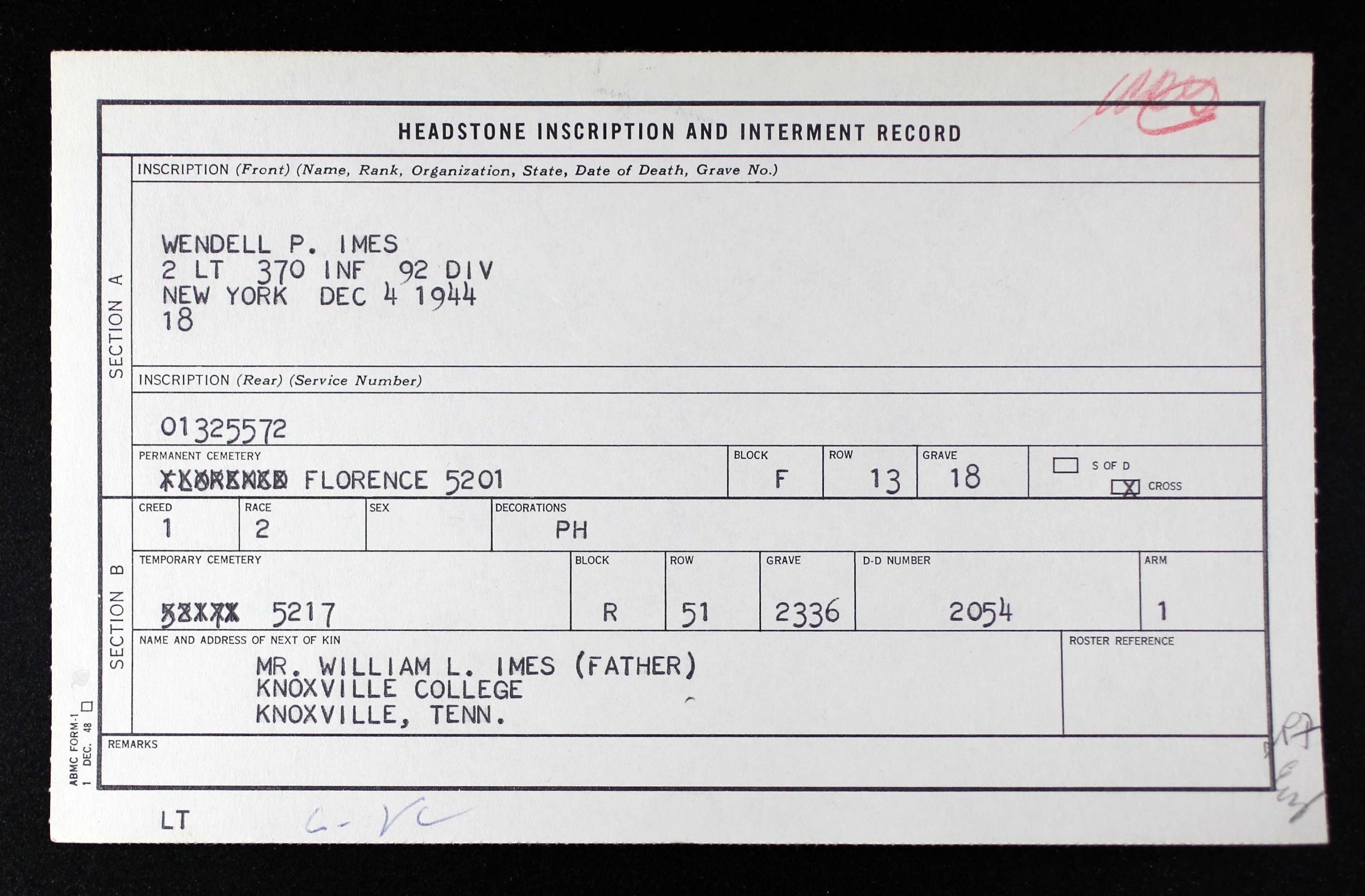 Wendell Phillips Imes was born on June 8, 1916, in Plainfield, New Jersey and was the son of William Lloyd Imes and Grace Virginia Frank. His father was president of Knoxville College. He was married to Anita Lloyd Rogers. He lived in Philadelphia in 1920 and resided in New York, NY, in the 1940s. He enlisted in New York City on May 1, 1942