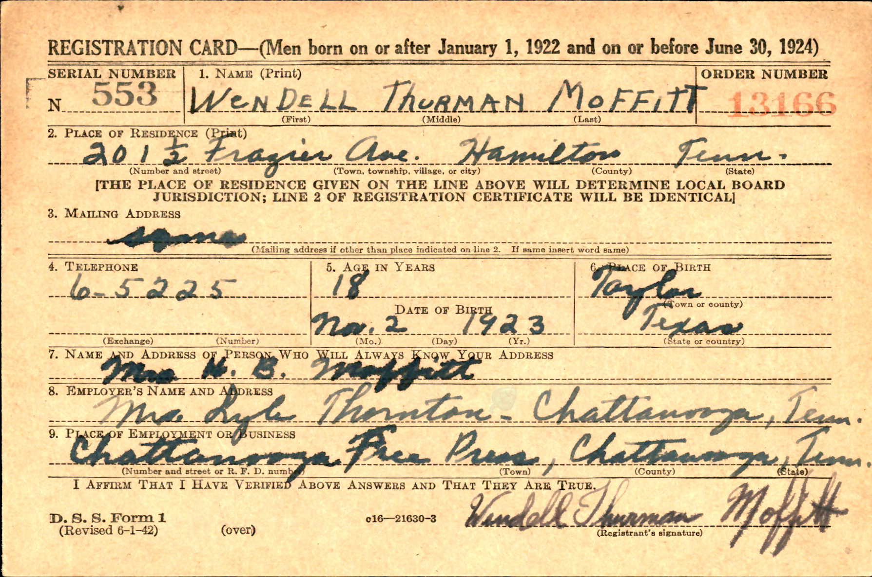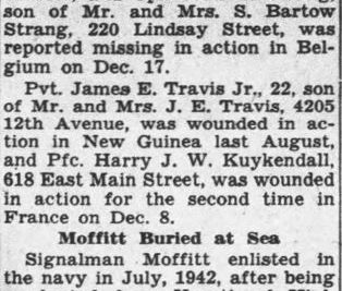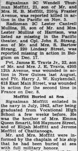 Signalman 3C Wendell Thurman Moffitt, 21, son of Mr. and Mrs. H.B. Moffitt, 210½ Frazier Avenue, was reported killed in action in the Pacific on Nov. 5. Signalman Moffitt enlisted in the navy in July, 1942, after being graduated from Vocational High School a few weeks before. He was the brother of Mrs. Emma Queen Smartt, 508 Haymore Street, and of Elijah Moffitt and Jerome Moffitt of Chattanooga. Mr. and Mrs. Moffitt were informed by the chaplain of his ship that he had been buried at sea with full military honors.