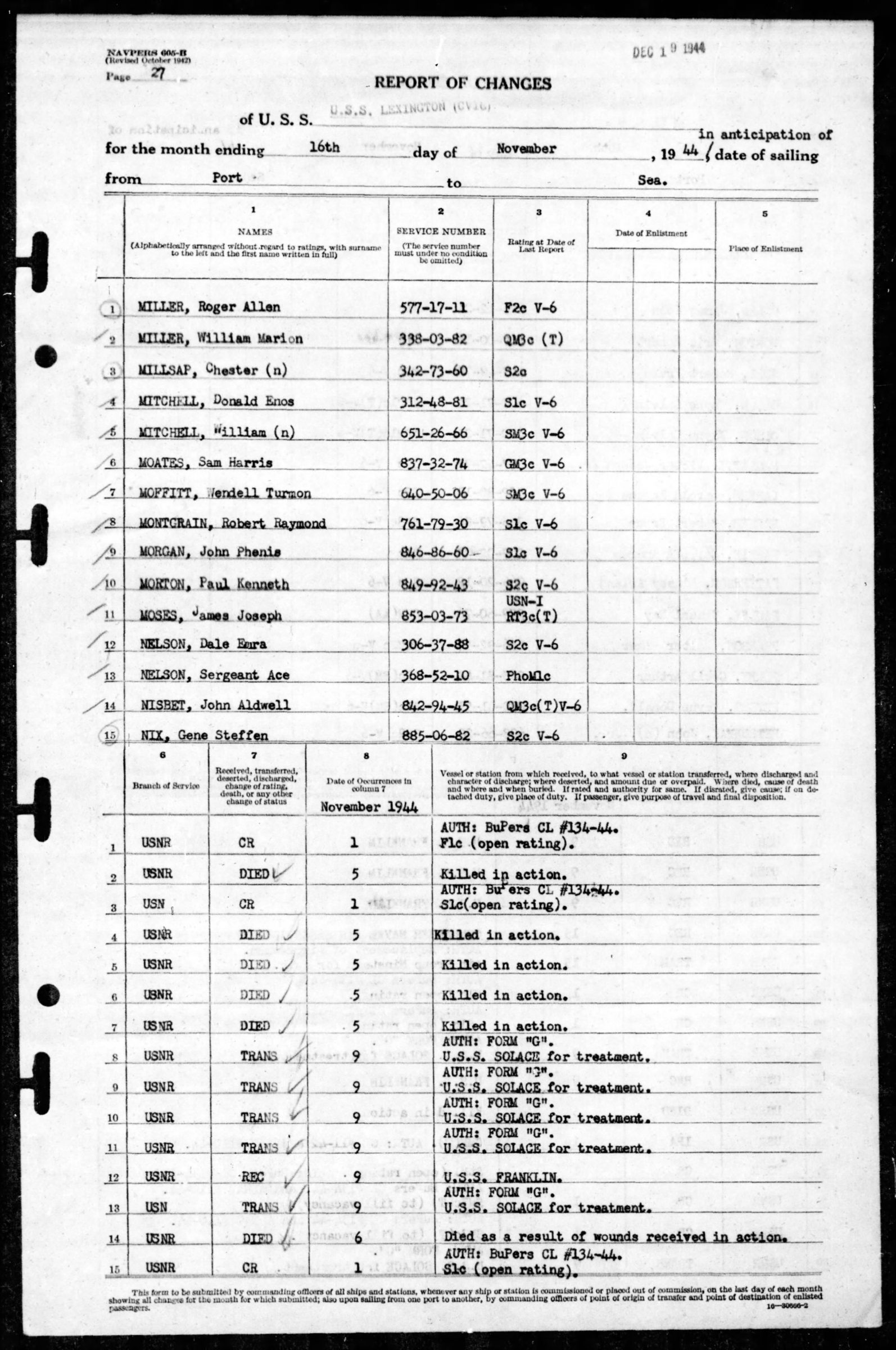 He was a signalman on the USS Lexington CV-16. He was killed at Tarawa, buried at sea 5 November 1944. The aircraft carrier USS Lexington was badly damaged by Kamikaze attacks off Luzon.
