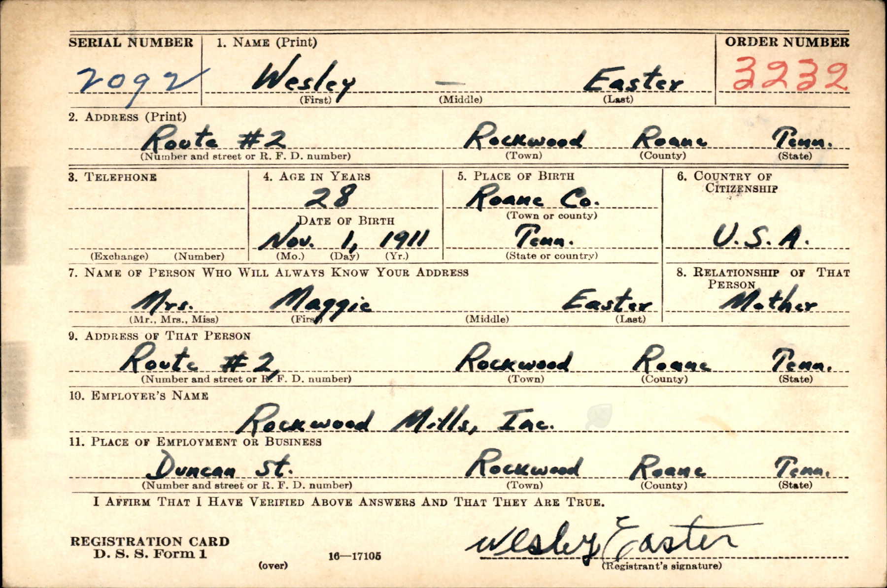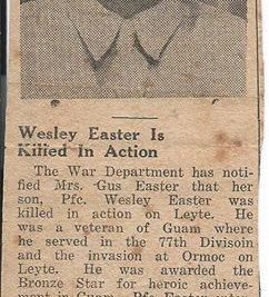 “Wesley Easter Is Killed In Action. The War Department has notified Mrs. Gus Easter that her son, Pfc. Wesley Easter was killed in action on Leyte. He was a veteran of Guam where he served in the 77th Division and the invasion at Ormoc on Leyte. He was awarded the Bronze Star for heroic achievement in Guam. Pfc. Easter entered service April 11, 1942. He has been in the Pacific 11 months. He has two brothers in the Pacific zone, Sgt. Floyd Easter, of Hawaii and T5 Herman H. Easter of New Guinea. On December 9, 1944, on the Island of Leyte, P.I., Private First Class Wesley Easter , while in action against the enemy, was advancing with his Company when he observed a wounded man. In attempting to aid this man he was killed instantly by enemy rifle fire.”