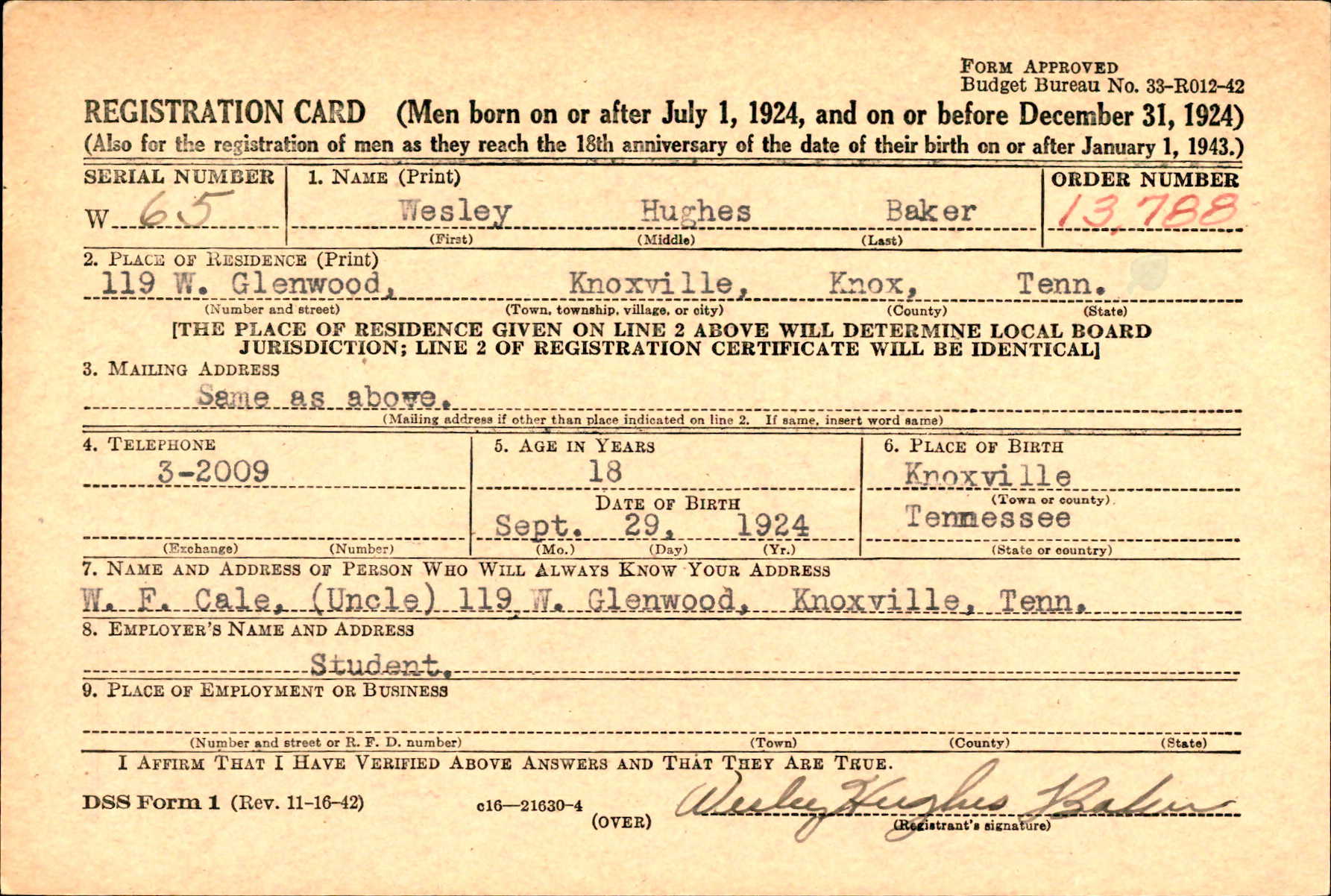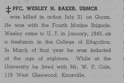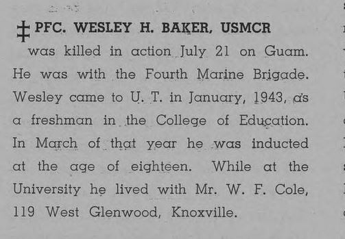 Pfc. Wesley H. Baker, USMCR was killed in action July 21 on Guam. He was with the Fourth Marine Brigade. Wesley came to the University of Tennessee in January, 1943, as a fresman in the College of Education. In March of that year he was inducted at the age of eighteen. While at the University he lived with Mr. W.F. Cole, 119 West Glenwood, Knoxville.