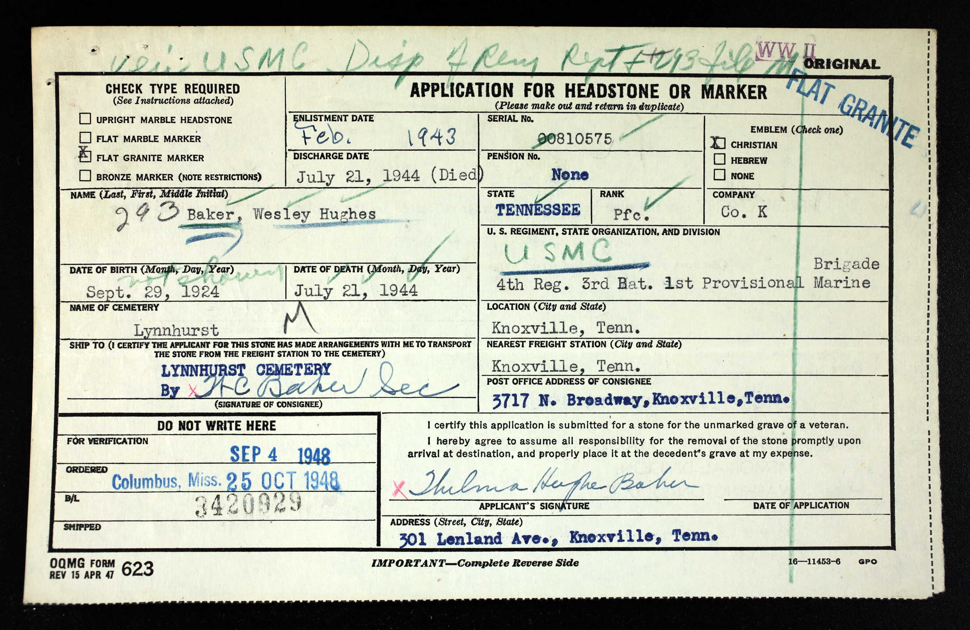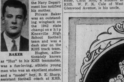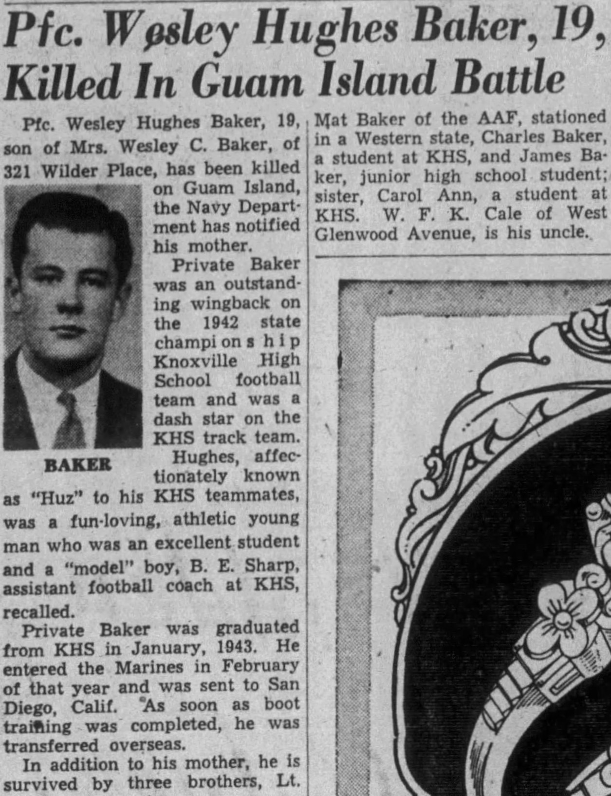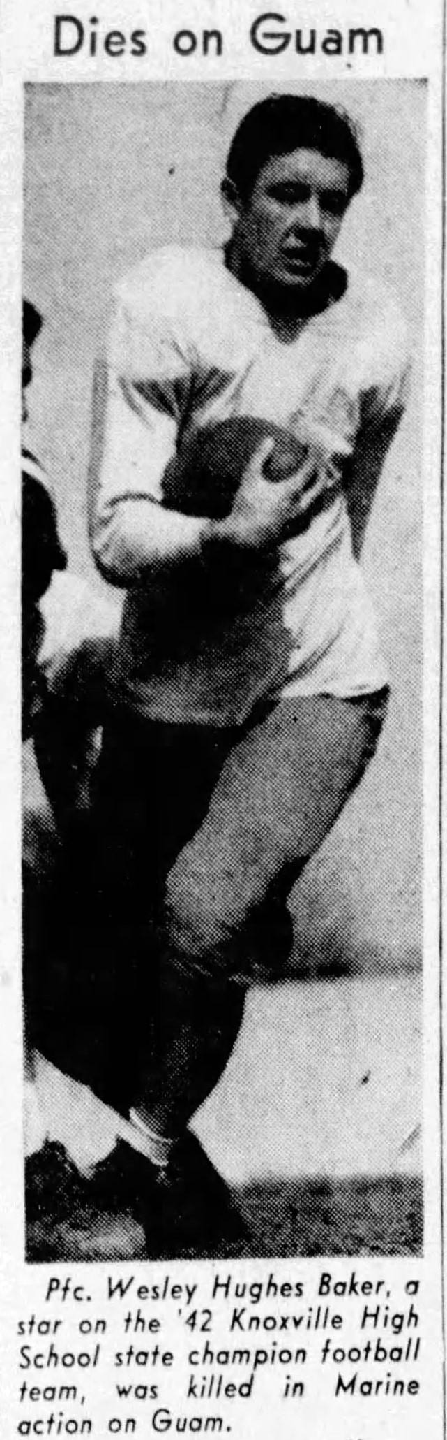 Pfc. Wesley Hughes Baker, 19, son of Mrs. Wesley C. Baker, of 321 Wilder Place, has been killed on Guam Island, the Navy Department has notified his mother. Private Baker was anno utstanding wingback on the 1942 state championship Knoxville High School football team and was a dash star on the KHS track team. Hughes, affectionately known as “Huz” to his KHS teammates, was a fun-loving, athletic young man who was an excellent student and a “model” boy, B.E. Sharp, assistant football coach at KHS, recalled. Private Baker was graduated from KHS in January, 1943. He entered the Marines in February of that year and was sent to San Diego, Calif. As soon as boot training was completed, he was transferred overseas. In addition to his mother, he is survived by three brothers, Lt. Mat Baker of the AAF, stationed in a Western state, Charles Baker, a student at KHS, and James Baker, junior high school student; sister, Carol Ann, a student at KHS. W.F.K. Cale of West Glenwood Avenue, is his uncle.