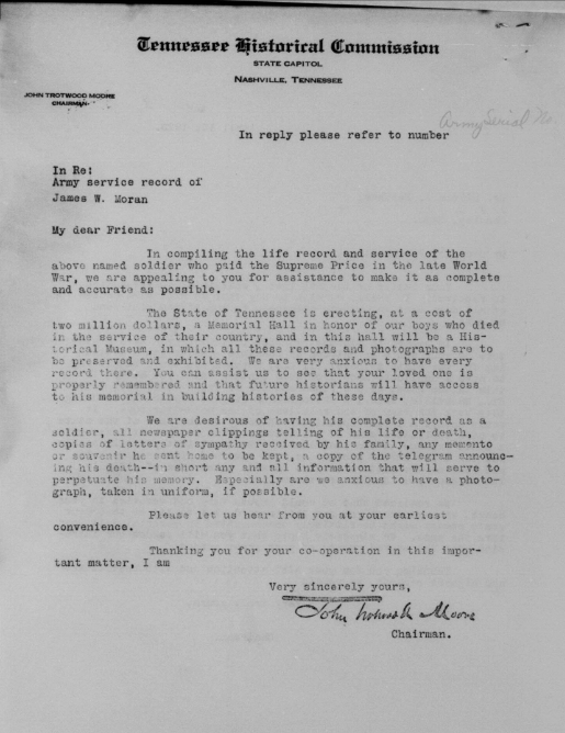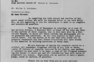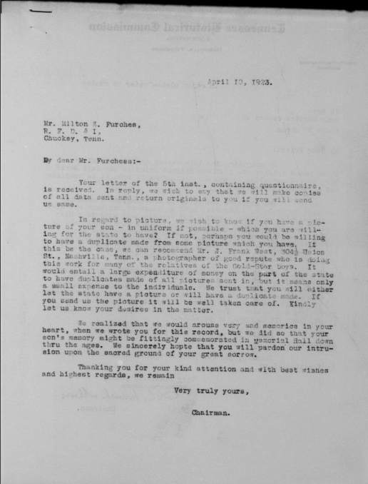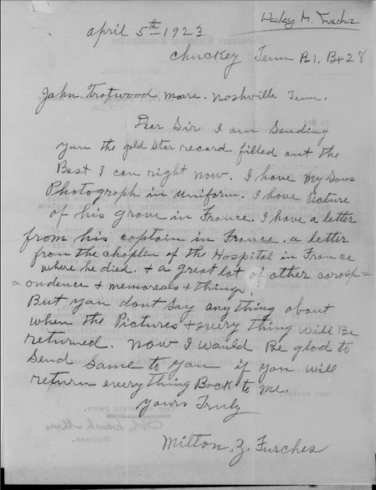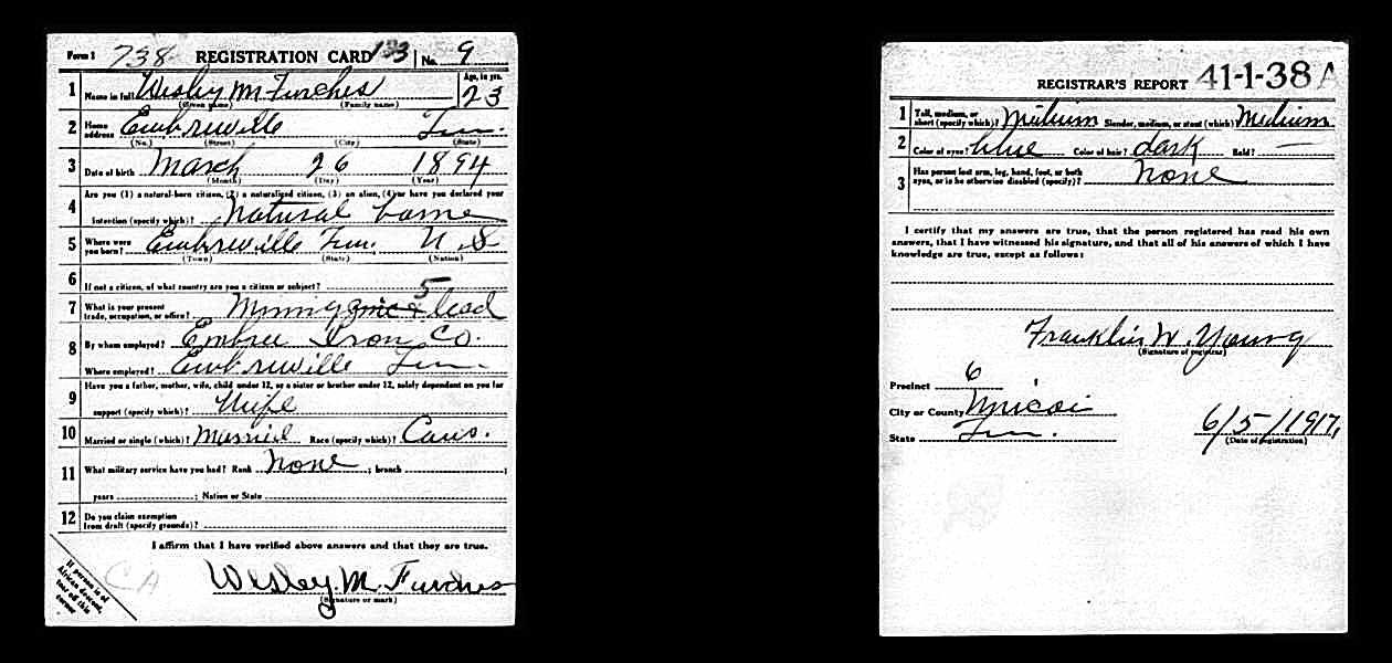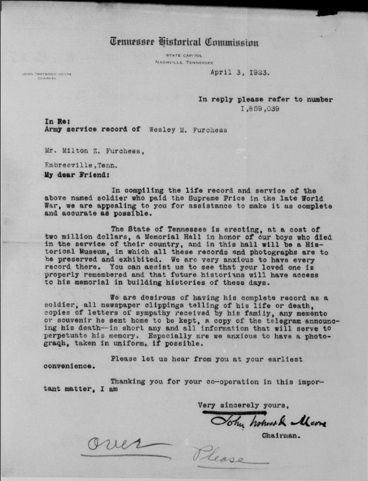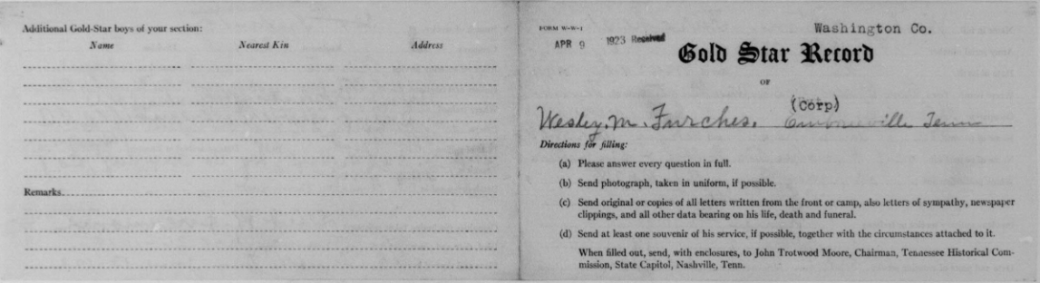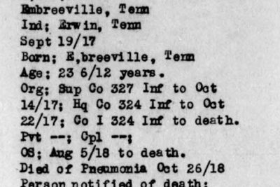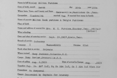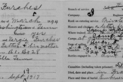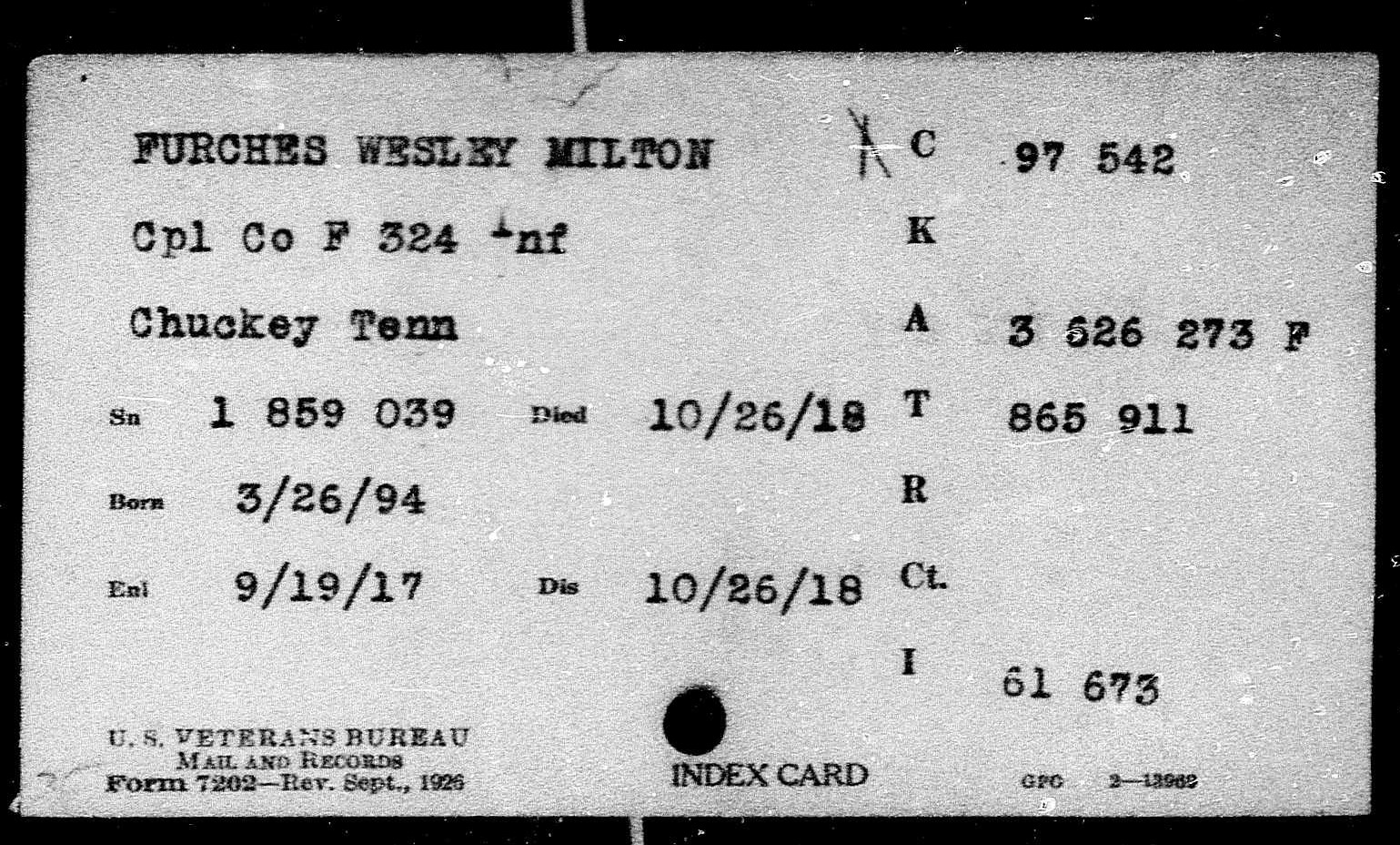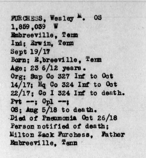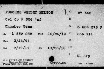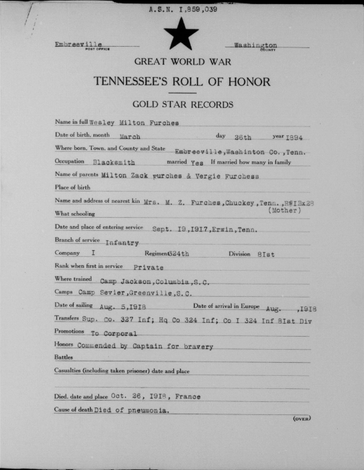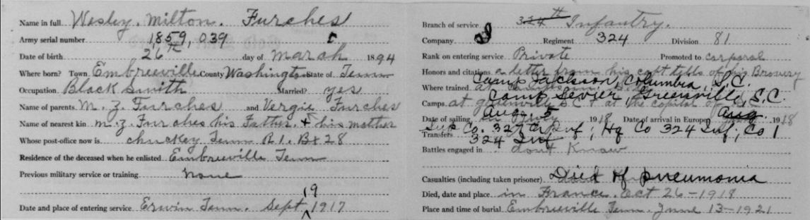 Corporal Furches was born in 1894 in Embreeville, Washington County. He served with the 324th Infantry Regiment, 81st Infantry Division and fought during the Meuse-Argonne offensive. He died of pneumonia on October 26, 1918 at age 24, and is buried at Bumpus Cove Cemetery, Embreeville, Tennessee.