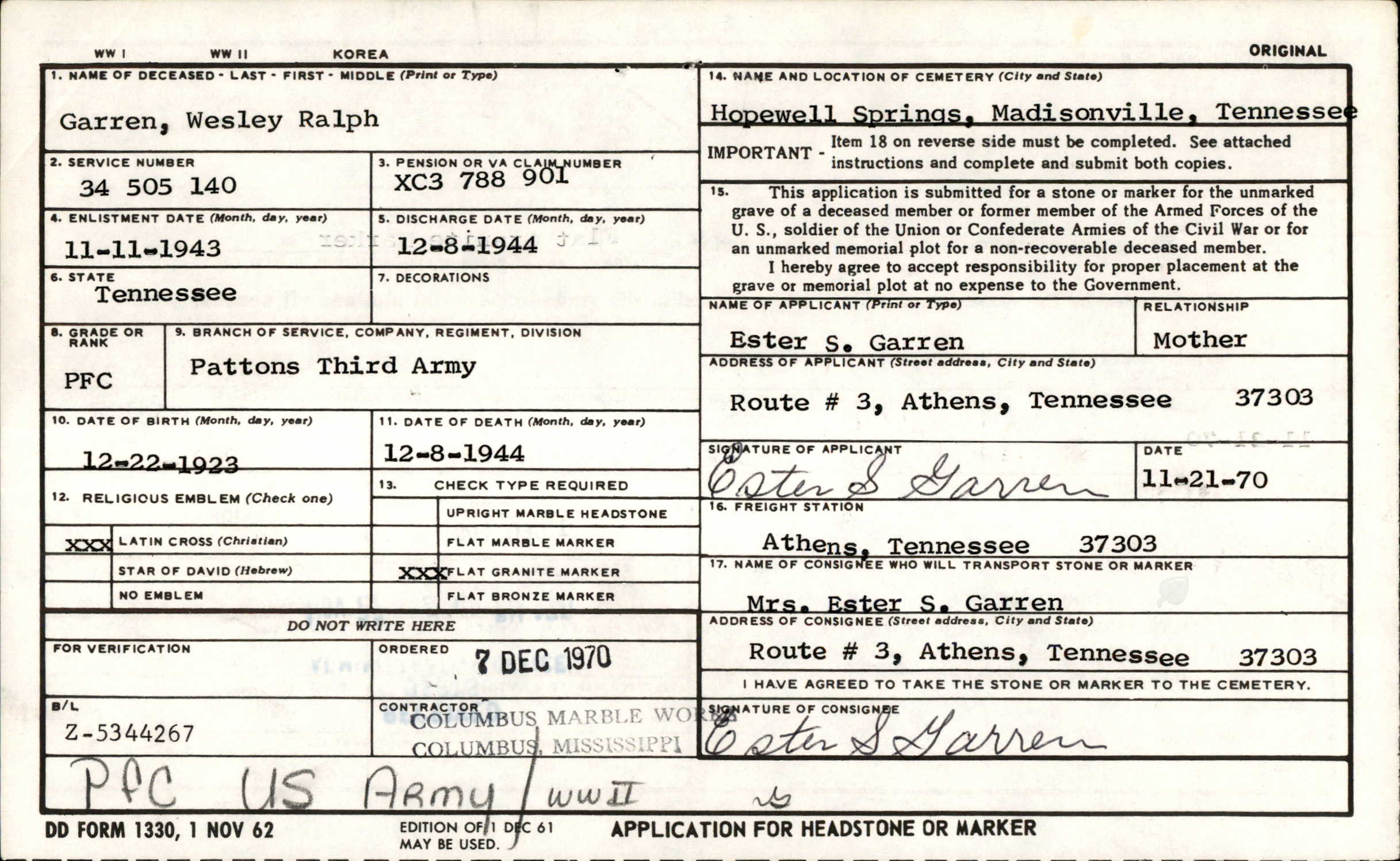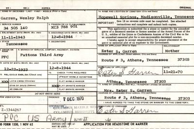 Private Garren was repatriated back to his hometown of Madisonville in 1948 and was buried at Hopewell Baptist Church Cemetery near Vonore.