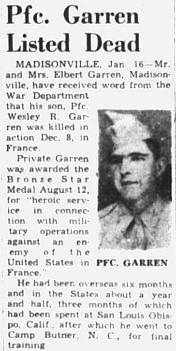 Madisonville, Jan. 16- Mr. and Mrs. Elbert Garren, Madisonville, have received word from the War Department that his son, Pfc. Wesley R. Garren was killed in action Dec. 8 in France.