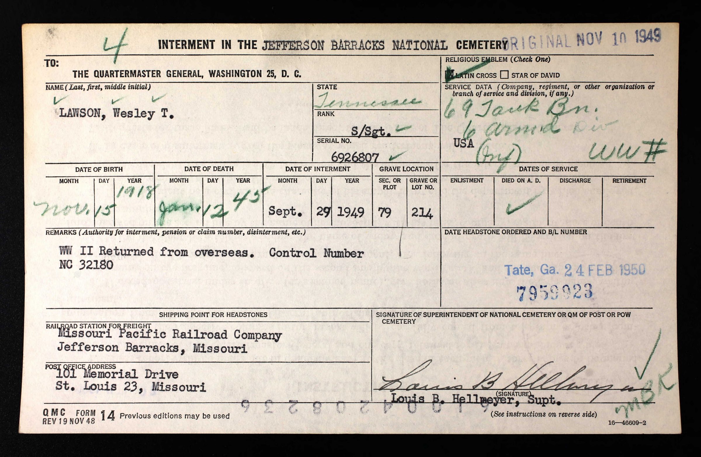 - Burial/Memorial Location: Jefferson Barracks National Cemetery, St. Louis, Missouri