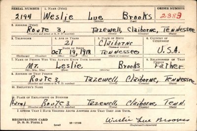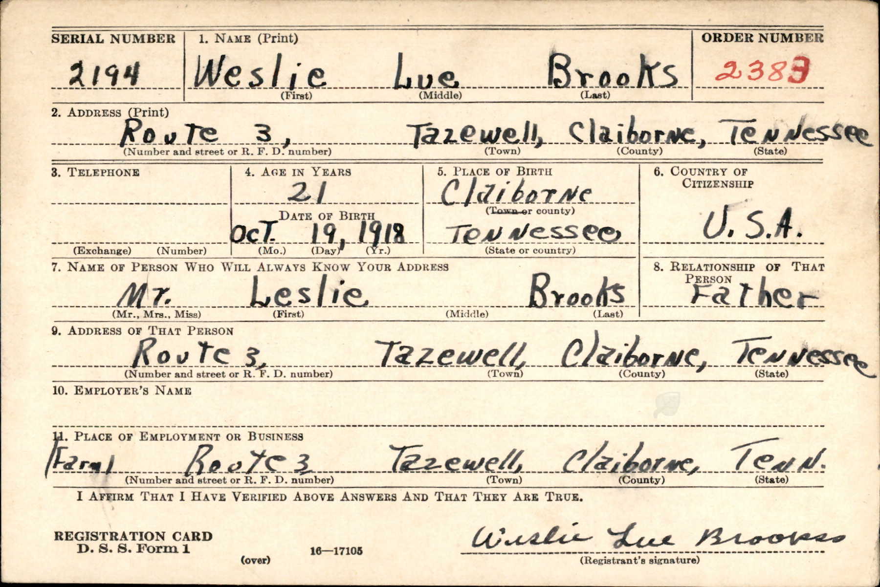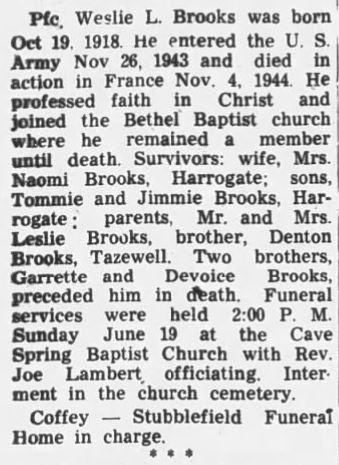 Pfc. Weslie L. Brooks was born Oct. 19, 1918. He entered the U.S. Army Nov. 26, 1943 and died in action in France Nov. 4, 1944. He professed faith in Christ and joined the Bethel Baptist church where he remained a member until death. Survivors: wife, Mrs. Naomi Brooks, Harrogate; sons, Tommie and Jimmie Brooks, Harrogate; parents, Mr. and Mrs. Leslie Brooks, brother Denton Brooks, Tazewell. Two brothers, Garrette and Devoice Brooks preceded him in death.