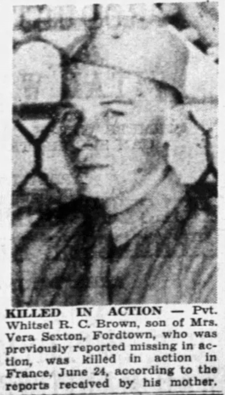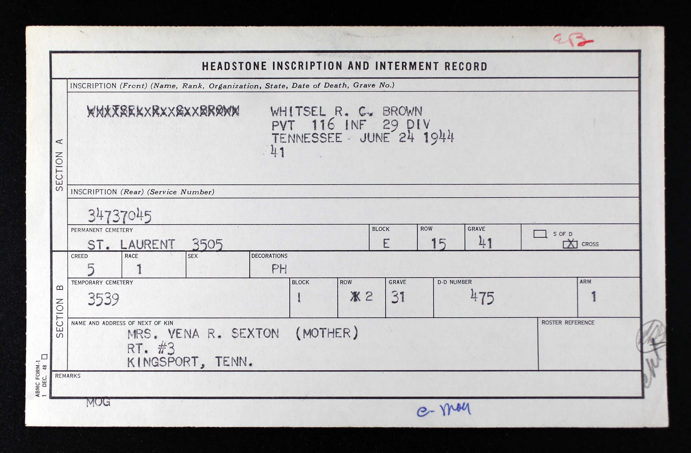 Private Whitsel R. C. Brown was assigned to the 116th Infantry Regiment, 29th Infantry Division. The 116th landed on Omaha Beach on the 6th of June and was the first unit to reach the bluffs beyond the beach. It then began a slow battle through the Bocage of the Normandy countryside. Private Brown was killed in action on 24th of June 1944 and is interred at E,15,41, Normandy American Cemetery, Colleville-sur-Mer, France.