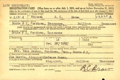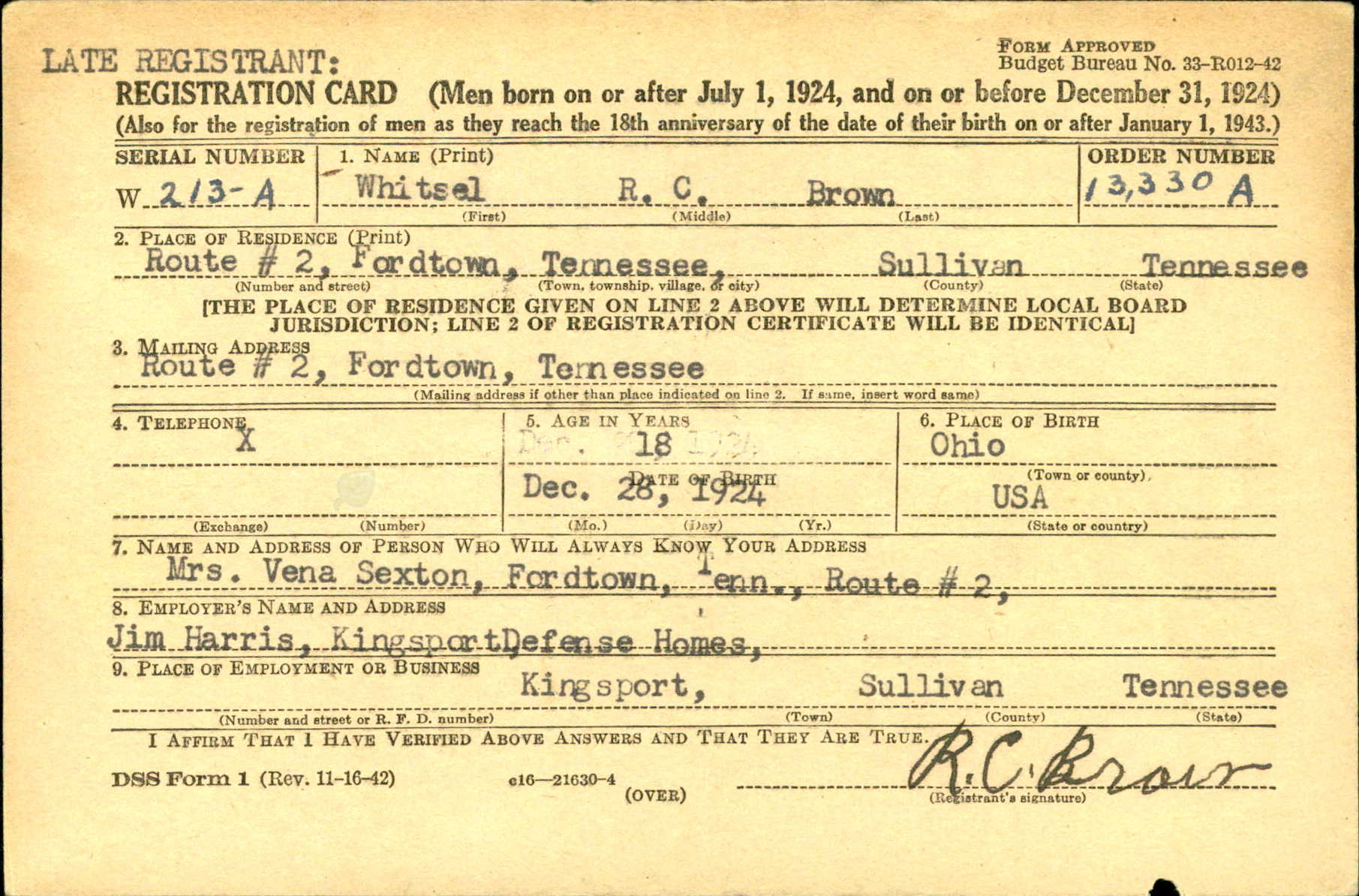 Private Brown had been in service one year and overseas one month. He was employed at the Kingsport Pross before entering service. He enlisted on 17 June 1943 at Fort Oglethorpe, Georgia.