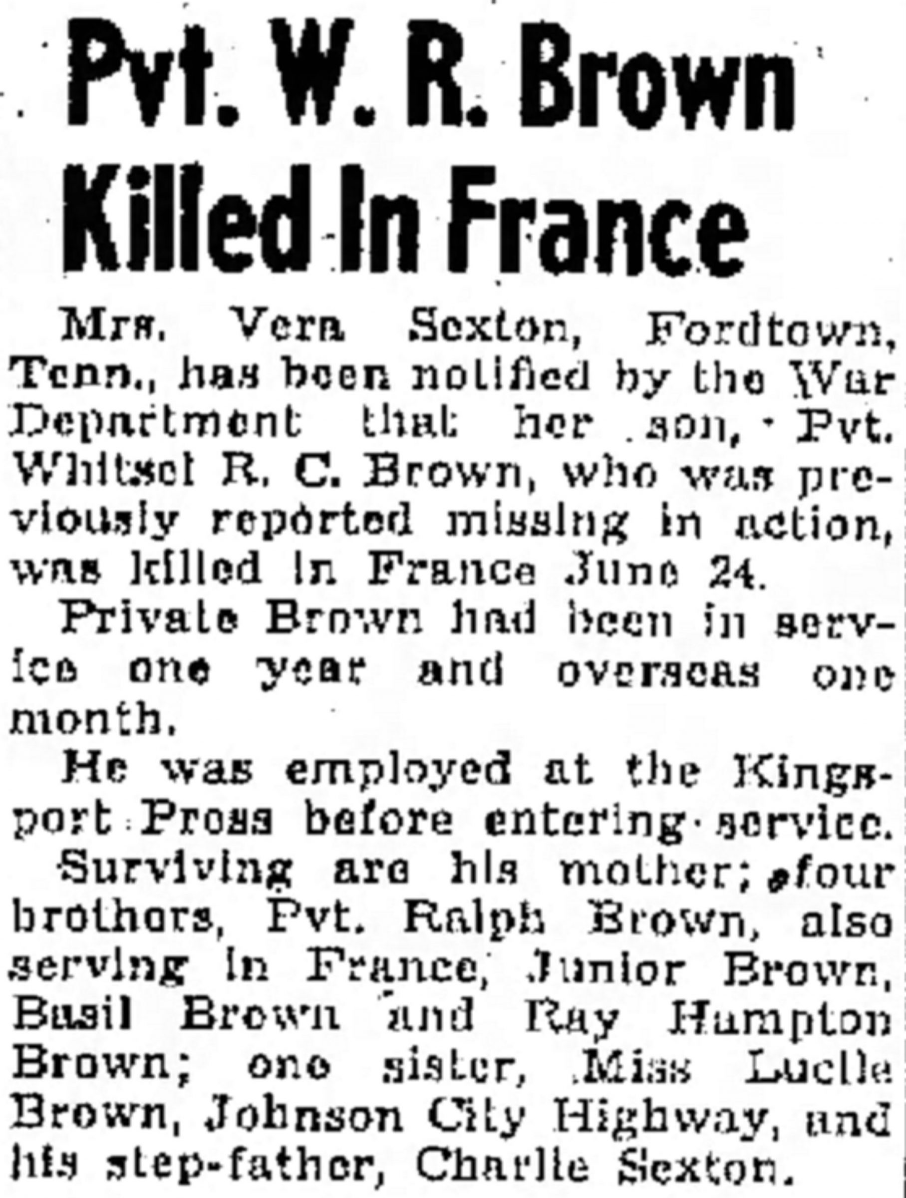 Surviving are his mother; four brothers, Pvt Ralph Brown, also serving in France, Junior Brown, Basil Brown and Ray Hampton Brown; one sister, Miss Lucile Brown, Johnson City Highway and his step-father, Charlie Sexton.