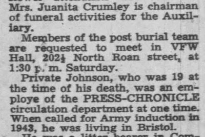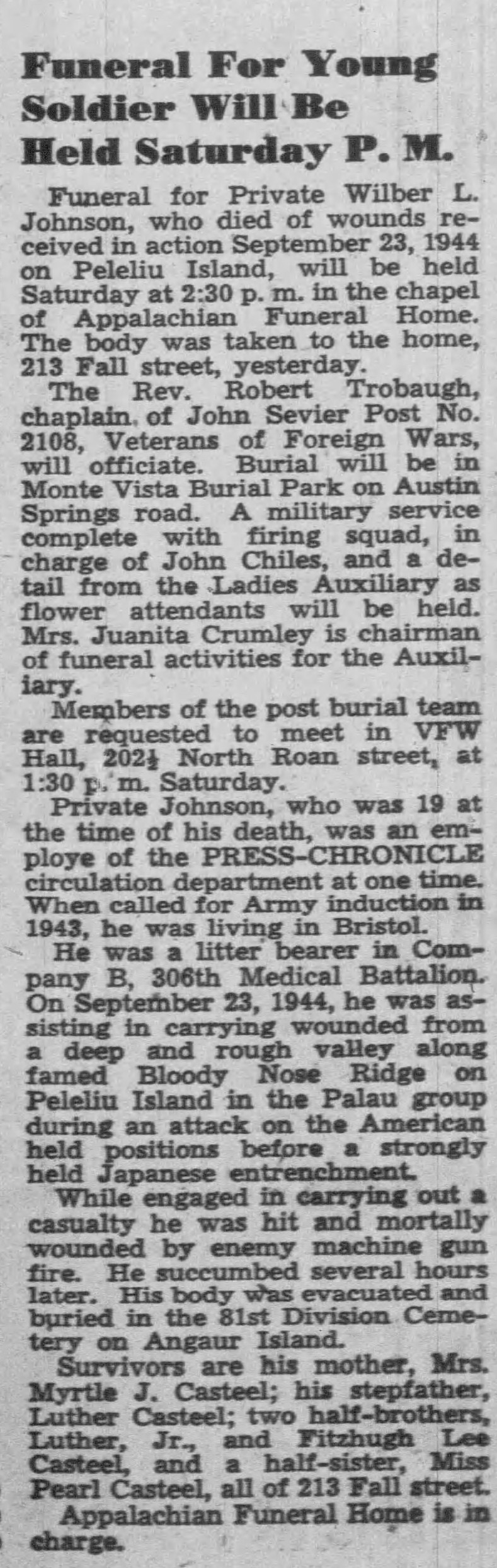 The body of Private Wilber Lee Johnson, a former carrier for the Press-Chronicle, who died of wounds received in action September 23, 1944, will arrive in Johnson City for reburial. Pvt. Johnson, who was 19 at the time of his death, was attached to a unit of the Army Medical Corps. He was a resident of Bristol at the time of his induction into military service in 1943. Surviving are his mother, Mrs. Myrtle J. Castell, of 213 Fall street; two half-brothers, Luther, Jr. and Fitzhugh Lee Castell, and a half-sister, Miss Pearl Castell.