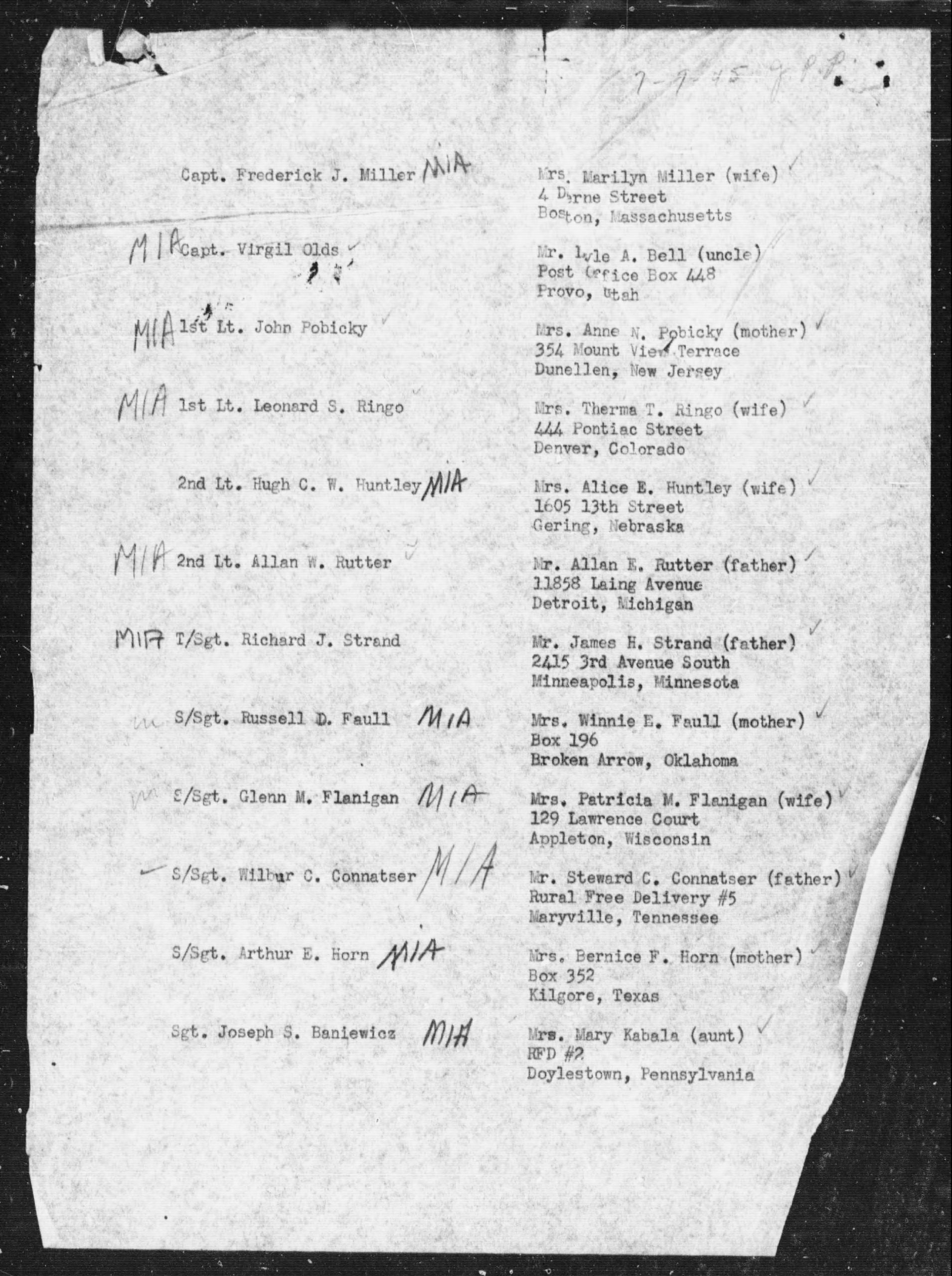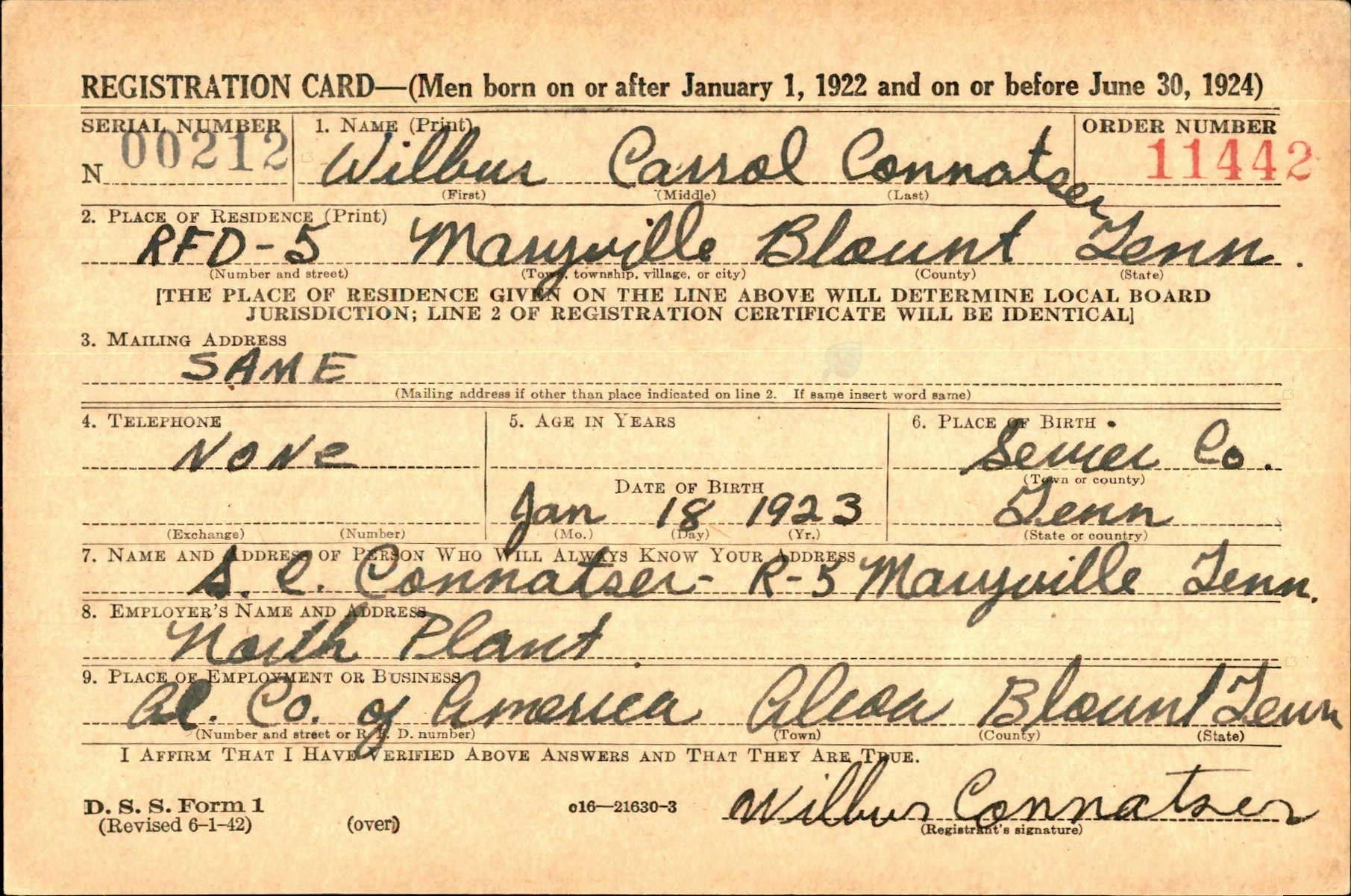 Staff Sergeant Wilbur C. Connatser was born on January 18, 1923, and was raised on a farm in Carpenters Campground in Blount County, Tennessee. His parents were Stuart C. and Lillie F. Connatser. His siblings were Iva Connatser, Bertha Connatser, Cecil Connatser, Elizabeth Connatser, James Connatser, Ruth Connatser, and Neoma Connatser. He enlisted in the Army Air Corps for service in World War II on January 9, 1943. He served in the Pacific Theater in the 874th Bomber Squadron, 498th Bomber Group, Very Heavy. He died on 24 May 1945 and officially declared dead on 25 May 1946, and is memorialized at Honolulu Memorial in Honolulu, Hawaii. He is buried in Kagleys Chapel Cemetery in Blount County, Tennessee. He was awarded an Air Medal with 3 Oak Leaf Clusters.