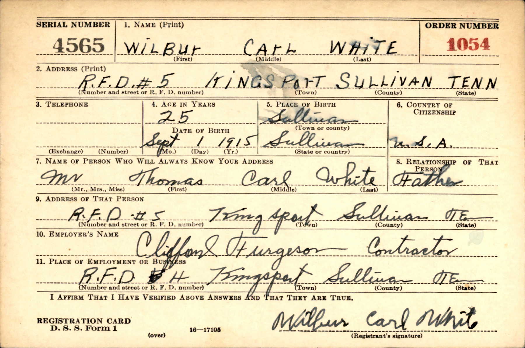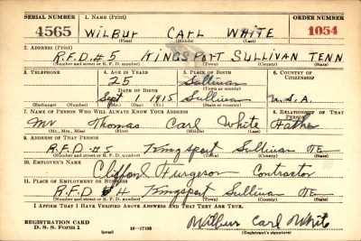 Wilbur Carl White was born in Sullivan County, Tennesseem the son of Thomas Carl White and Vesta Poe. Brother of Wilma White.