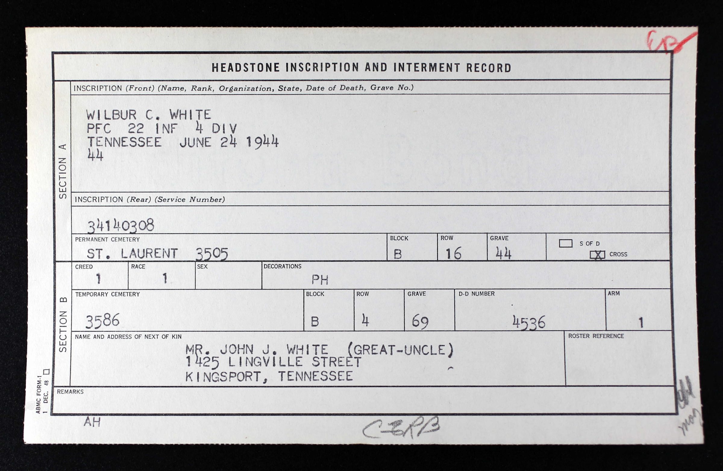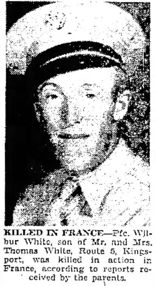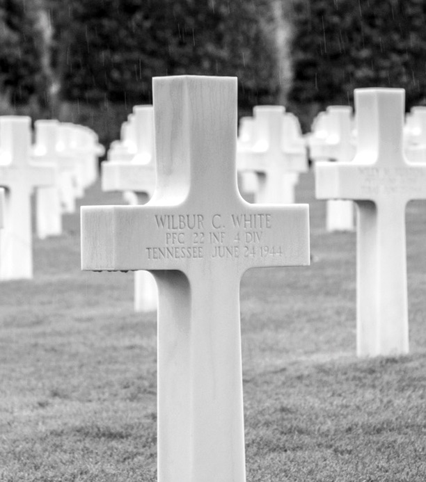 Wilbur White was initially buried at Sainte-Mère-Eglise #2 Cemetery at Carentan, France and reburied at Normandy American Cemetery at Colleville-sur-Mer, France, Plot B, Row 16, Grave 44