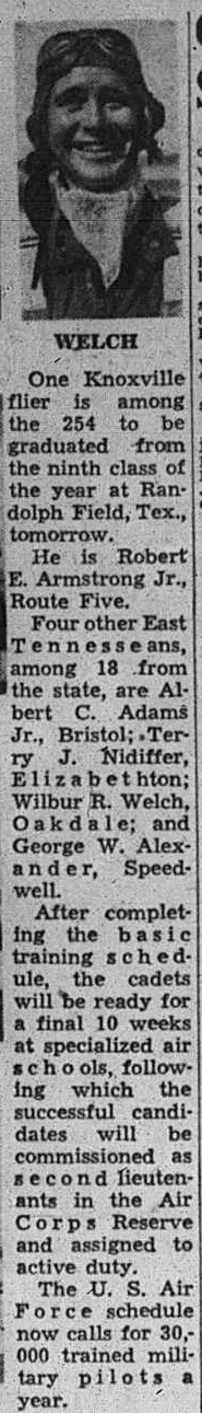 Wilbur R. Welch, Oakdale, has been graduated from the Ellington Field, Texas flying school, the world’s largest Multi-motor flying school, and he has been commissioned a second lieutenant in the U.S. Army Air Corps.