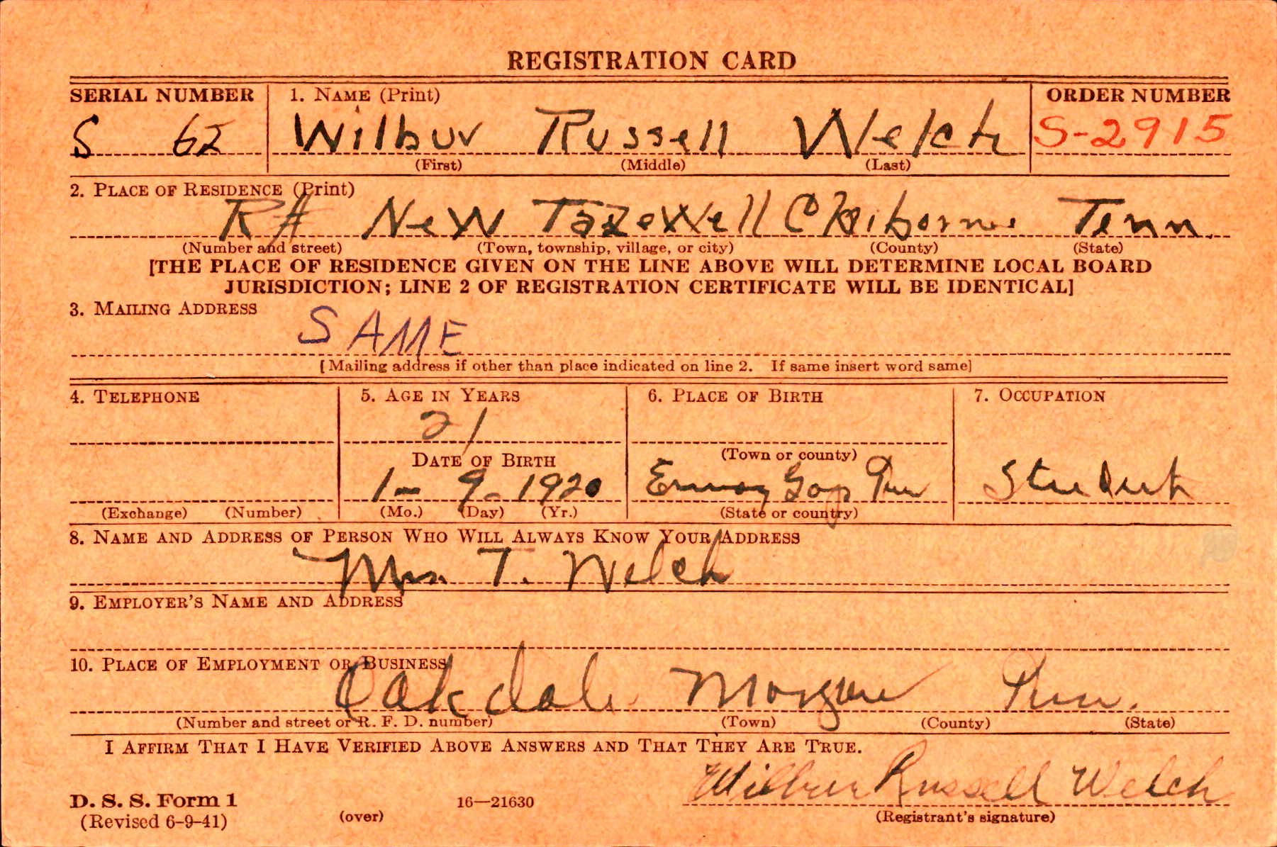 Wilbur Russell “Mickey” Welch was born 9 January 1920 to Reid Russell Welch and Sybil Pearl McCarroll. He married Clara Pauline Arnett on 23 April 1943 in Jellico, TN. He enlisted with the Air Corps as an Aviation Cadet on 14 July 1941 at Fort Oglethorpe in Georgia.