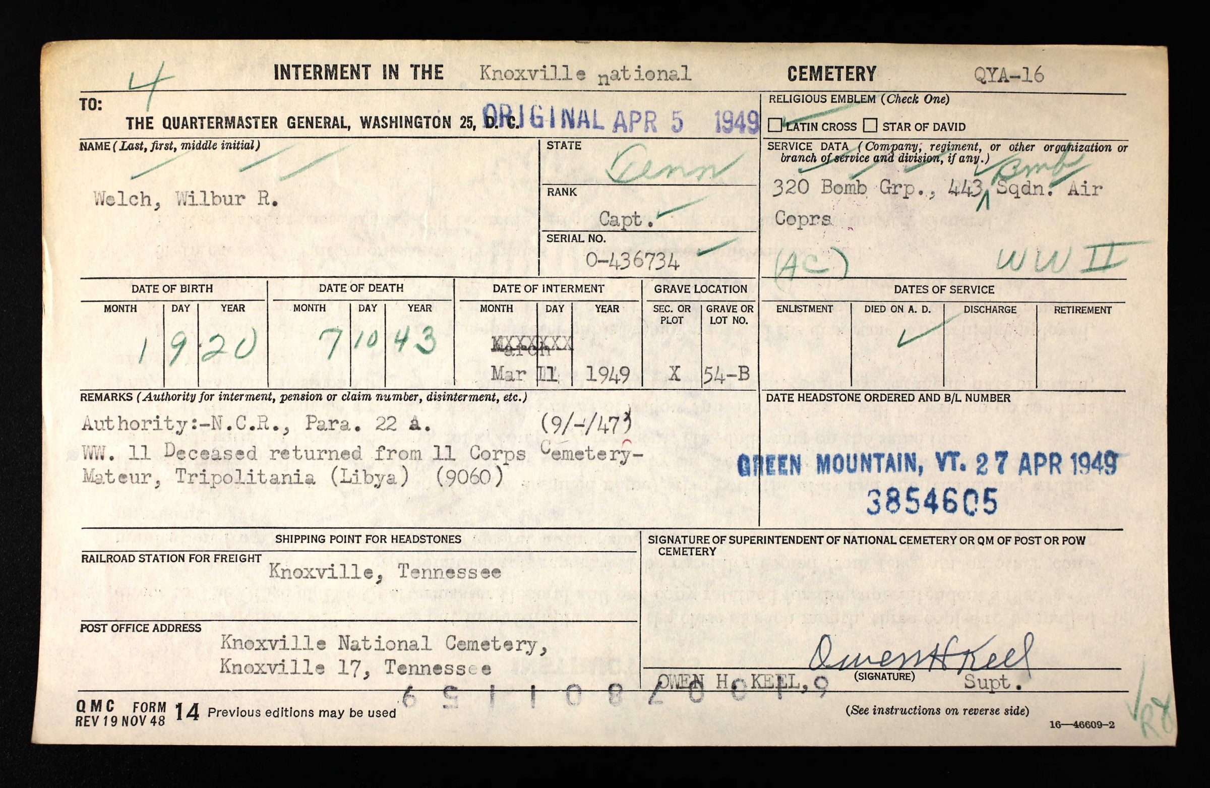 Captain Welch died 10 July 1943 and was initially buried at 11 Corps Cemetery Mateur, Tripolitania, Libya.