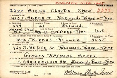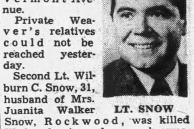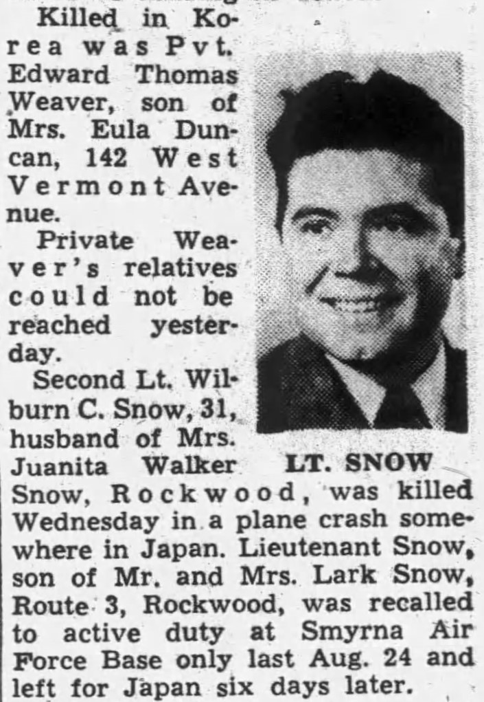Second Lt. Wilburn C. Snow, 31, husband of Mrs. Juanita Walker Snow, Rockwood, was killed Wednesday in a plane crash somewhere in Japan. Lieutenant Snow, son of Mr. and Mrs. Lark Snow, Route 3, Rockwood, was recalled to active duty at Smyrna Air Force Base only last Aug. 24, and left for Japan six days later. He had been on active duty only two weeks when his plane was destroyed by a typhoon in Japan. His wife, parents, one brother and two sisters survive him.