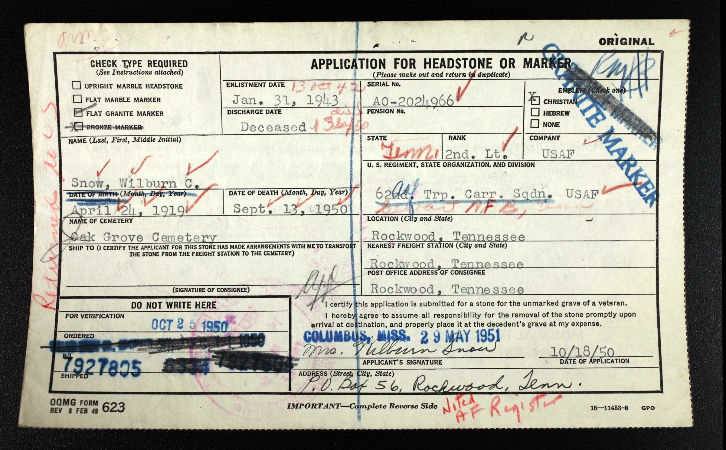 2nd Lt. Snow died on September 13, 1950 and was returned to the United States. He was buried at Oak Grove Cemetery in Rockwood, Tennessee.