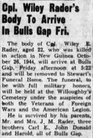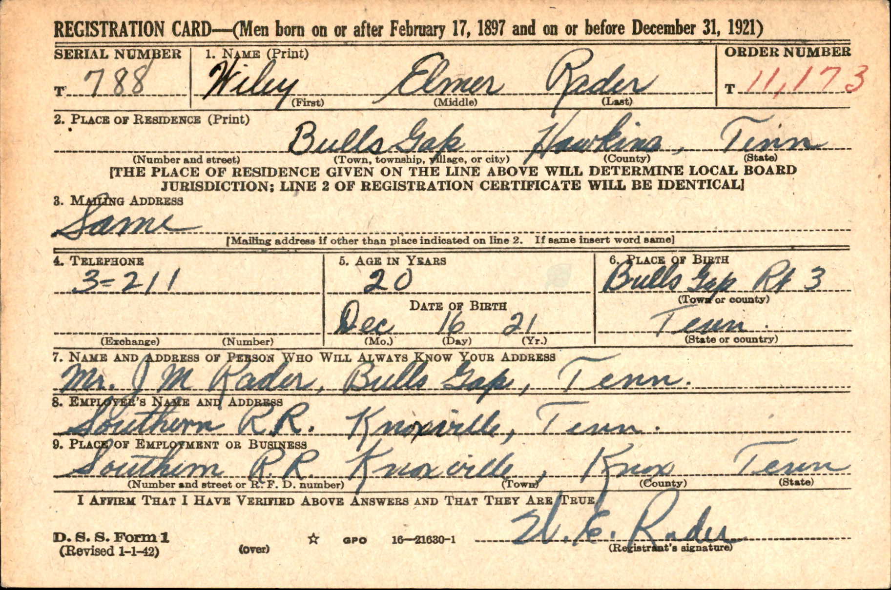 Wiley Elmer Rader was born on 16 December 1921, the son of John Marcus Rader and Elizabeth Baker Wygal.