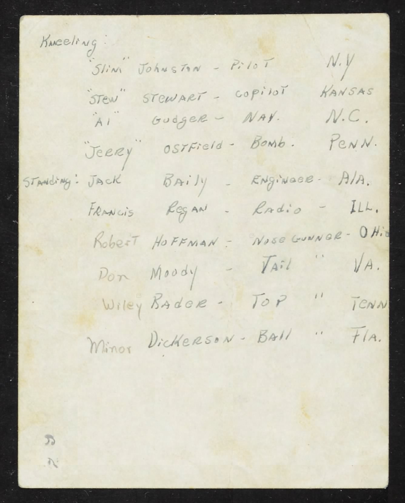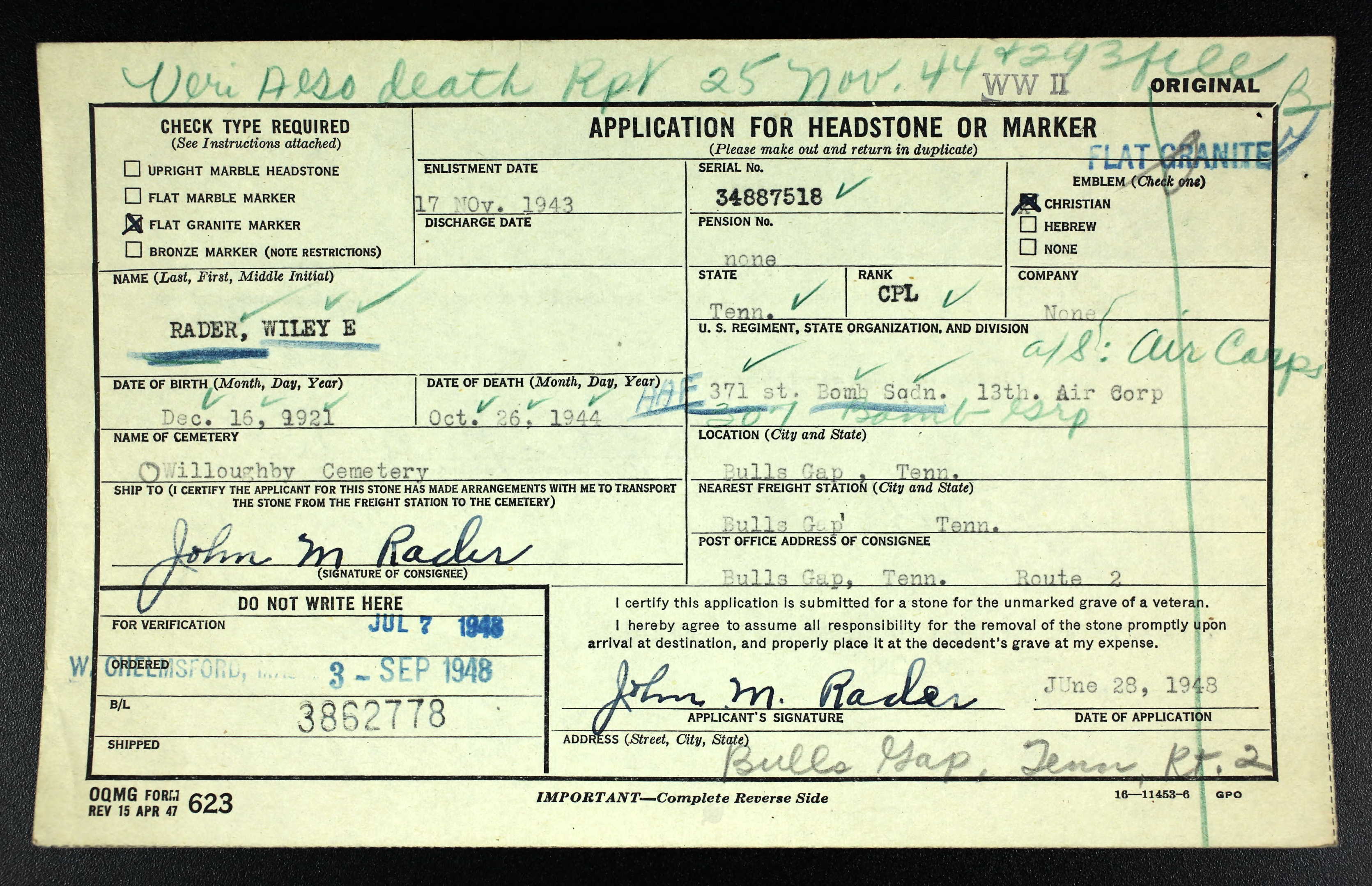My Uncle, Don Moody, was a crew member with Wiley Rader and was killed in the same plane crash on October 26, 1944. Don Moody is the 4th from the left in the second row of the photo. He was the tail gunner.