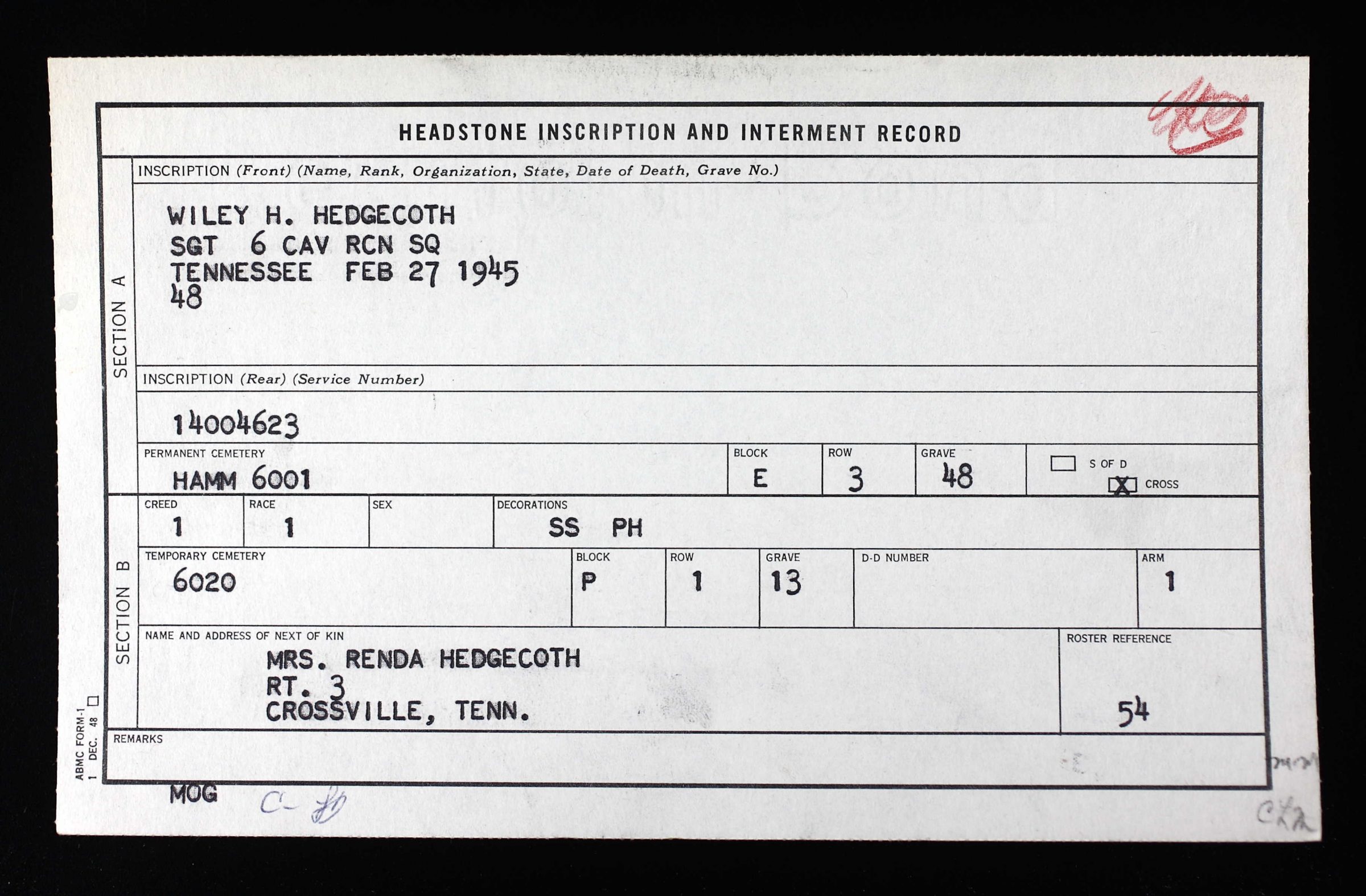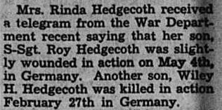 Mrs. Rinda Hedgecoth received a telegram from the War Department recent saying that her son, S-Sgt Roy Hedgecoth was slightly wounded in action on May 4th, in Germany. Another son, Wiley H. Hedgecoth was killed in action February 27th in Germany.