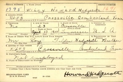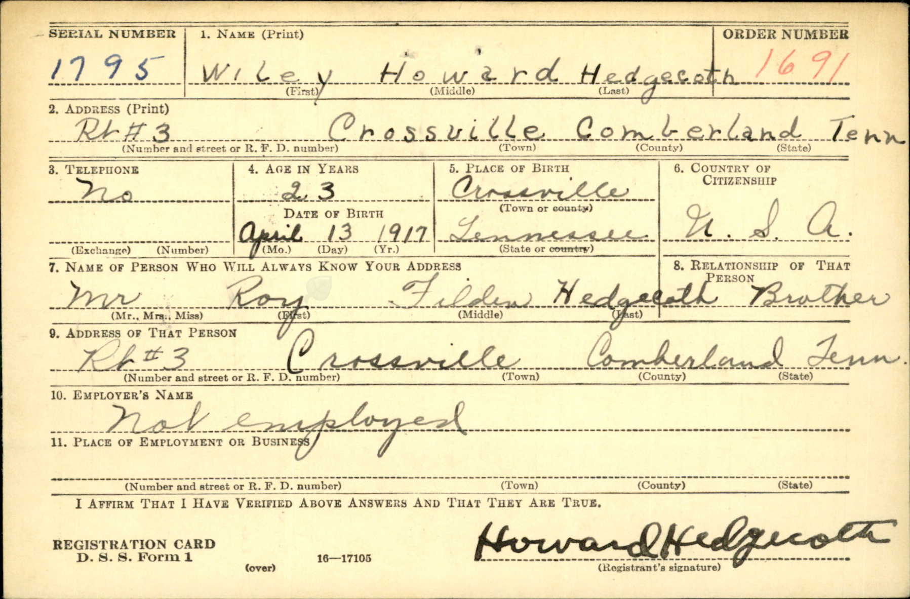 Wiley Howard Hedgecoth was born in Crossville, Tennessee, the son of Robert Burke Hedgecoth and Rinda Smith.
