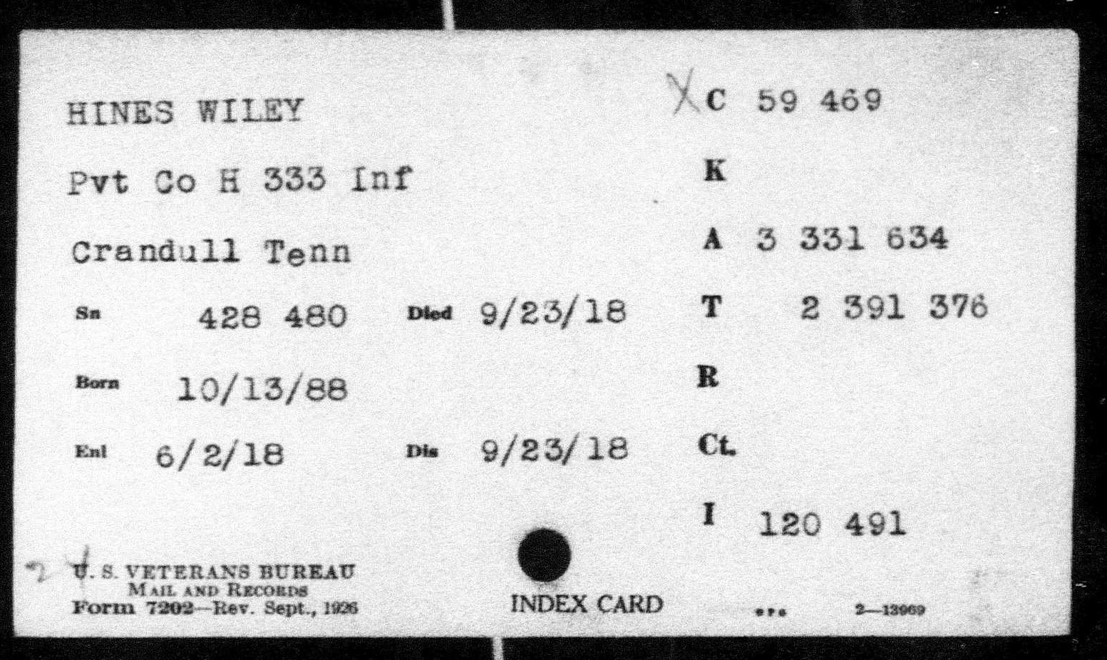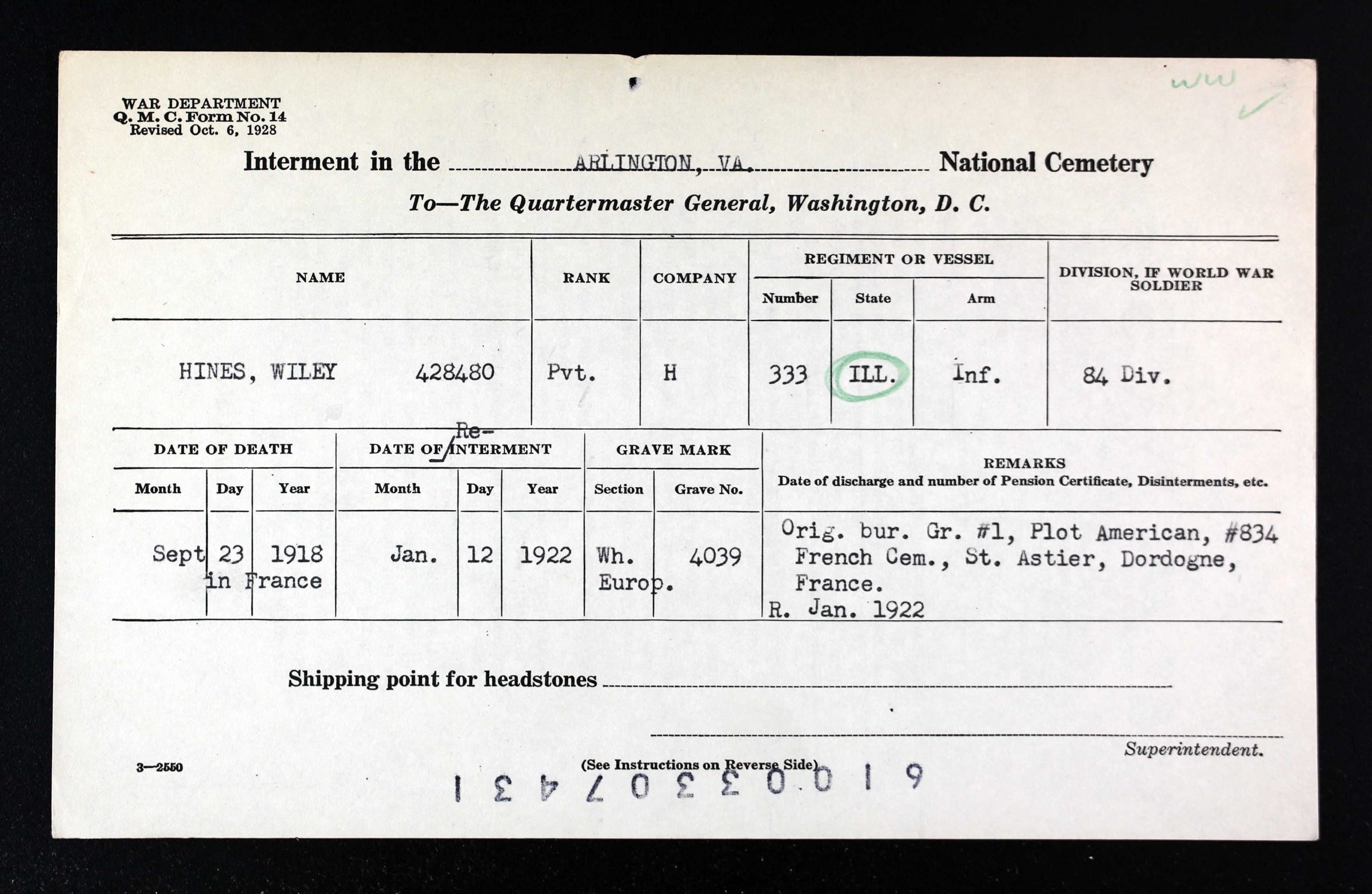 Pvt Hines served with Company H, 333rd Infantry Regiment, 84th Infantry Division. He died of disease in France and was initially buried at the French Cemetery at St. Astier, Dordogne in France. He was buried at Arlington National Cemetery in Virginia on 12 January 1922.