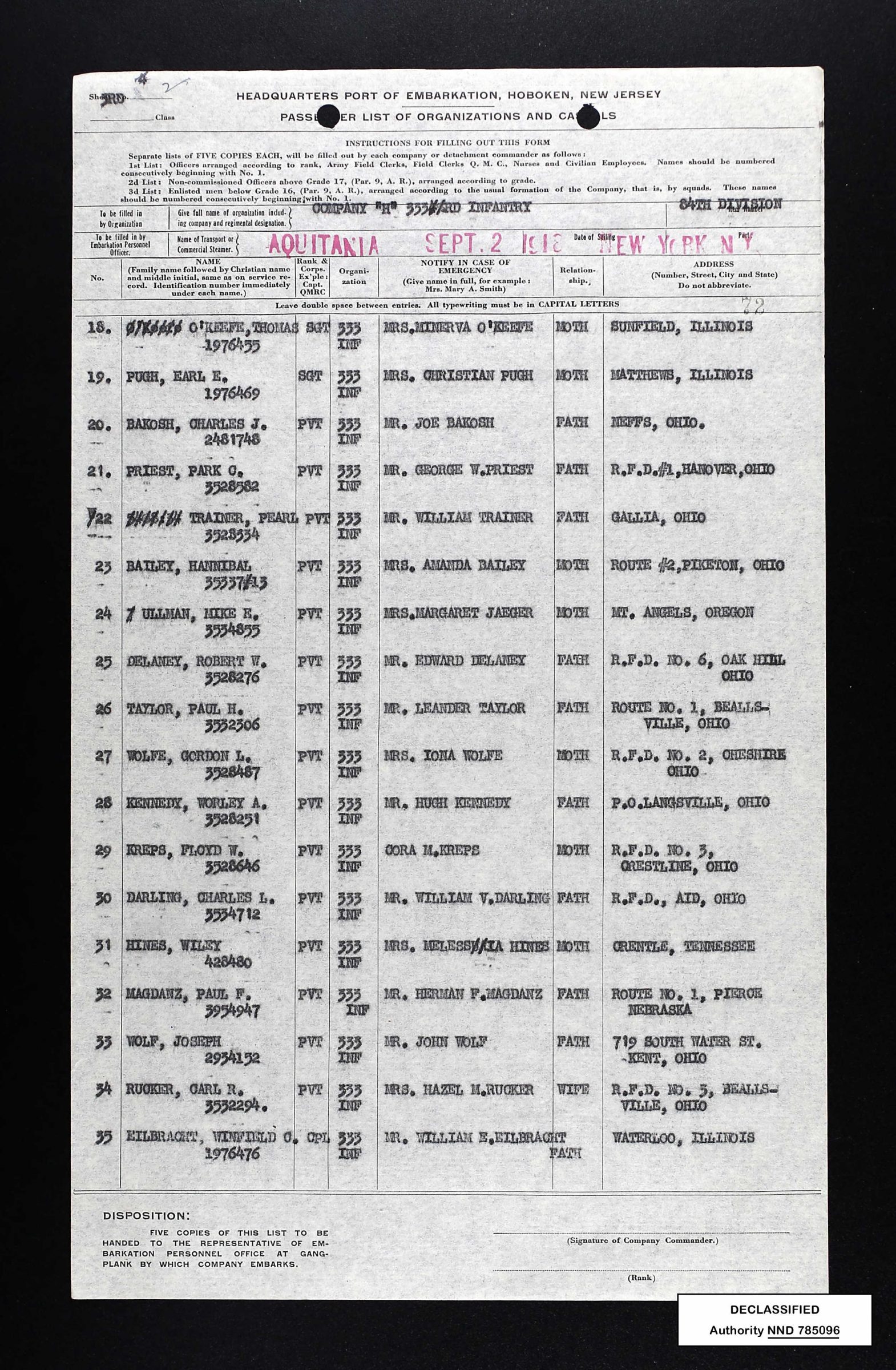 He sailed with the vessel Aquitania, departing from New York City, NY on 2 September 1918.