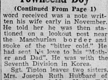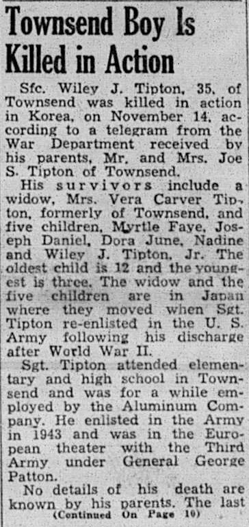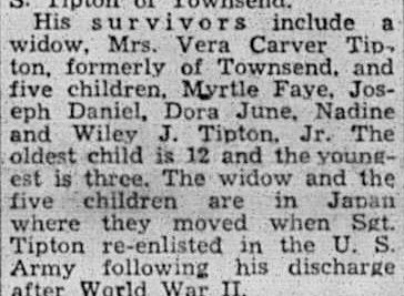 His survivors include a widow, Mrs. Vera Carver Tipton, formerly of Townsend, and five children, Myrtle Faye, Joseph Daniel, Dora June, Nadine and Wiley J. Tipton Jr. the oldest child is 12 and the youngest is three. The widow and the five children are in Japan where they moved when Sgt. Tipton re-enlisted in the U.S. Army following his discharge after World War II.