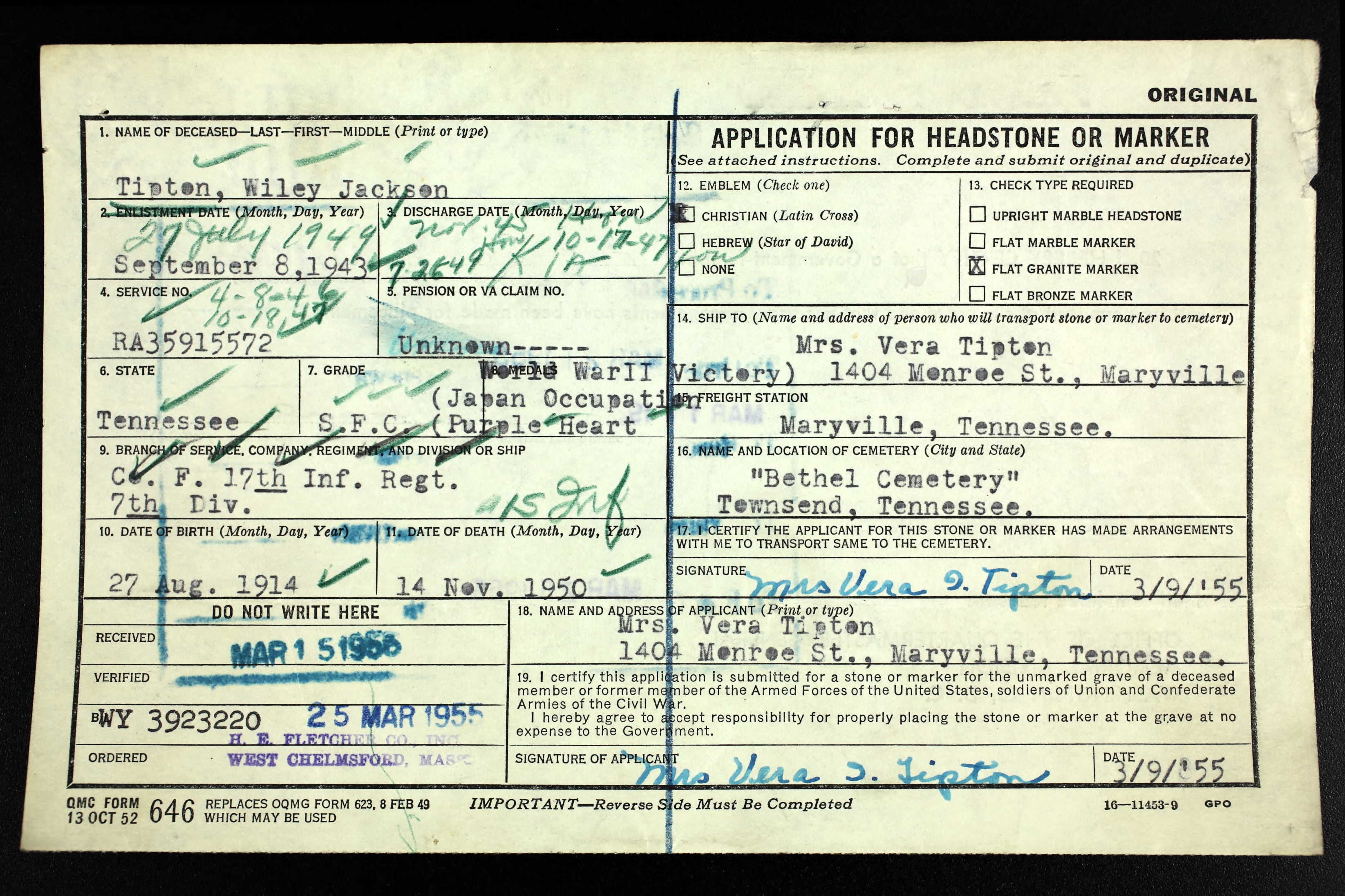 Wiley Jackson Tipton was a member of the 17th Infantry Regiment, 7th Infantry Division. He was Killed in Action while fighting the enemy in North Korea on November 14, 1950. He was the husband of Vera Imogene Carver and father of Myrttle Fay Tipton.