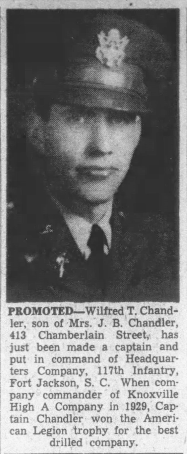 Wilfred T. Chandler, son of Mrs. J.B. Chandler, 413 Chamberlain Street, has just been made a captain and put in command of Headquarters Company, 117th Infantry, Fort Jackson, S.C. When company commander of Knoxville High A Company in 1929, Captain Chandler won the American Legion trophy for the best drilled company.