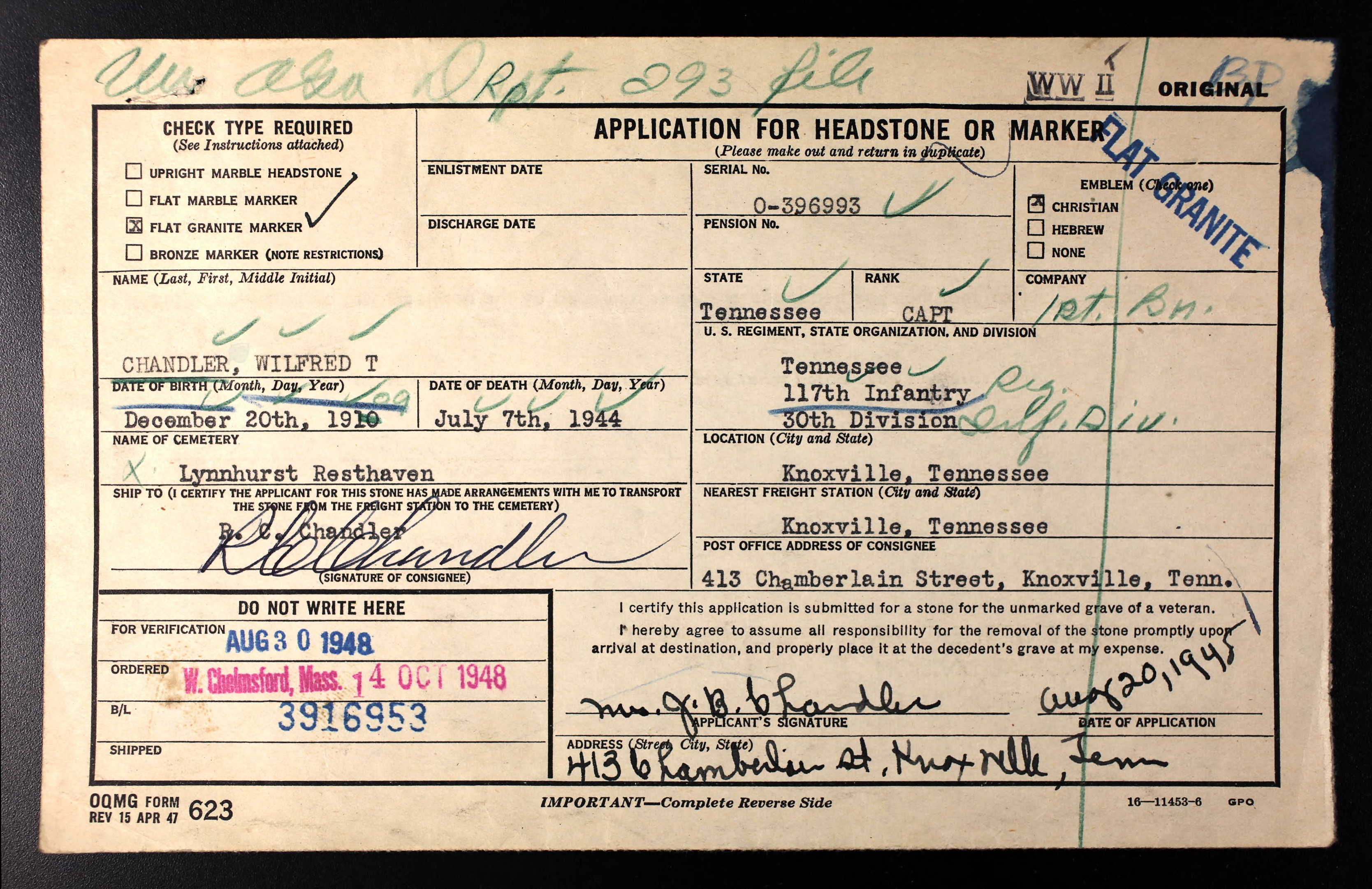 The body of Capt. Wilfred T. Chandler, killed in action near St. Lo, France on July 7, 1944, will arrive in Knoxville. Captain Chandler was the son of Mrs. J.B. Chandler, a member of the faculty at Tennessee School for the Deaf. He was in the National Guard at the start of the war, and was commissioned at the time the Guard was called into national service. He trained at various post in the Southeast and was promoted to captain before going voerseas in 1944. He served with the 117th Infantry, 30th (Old Hickory) Division. At the time of his death, he was acting as executive officer of his battalion and had been recommended for promotion to major. He was 34 years old.