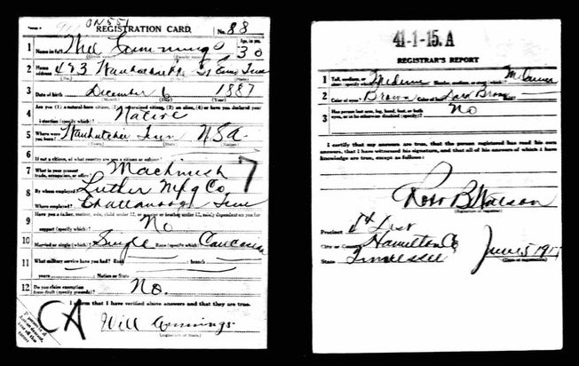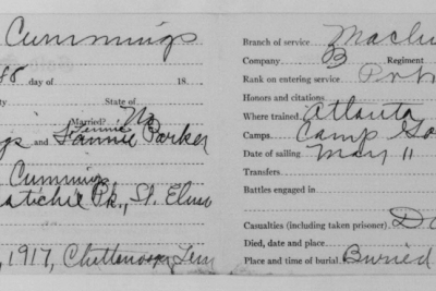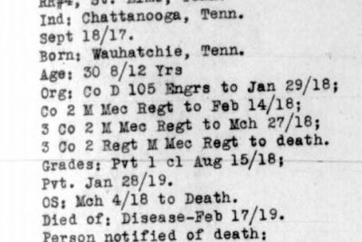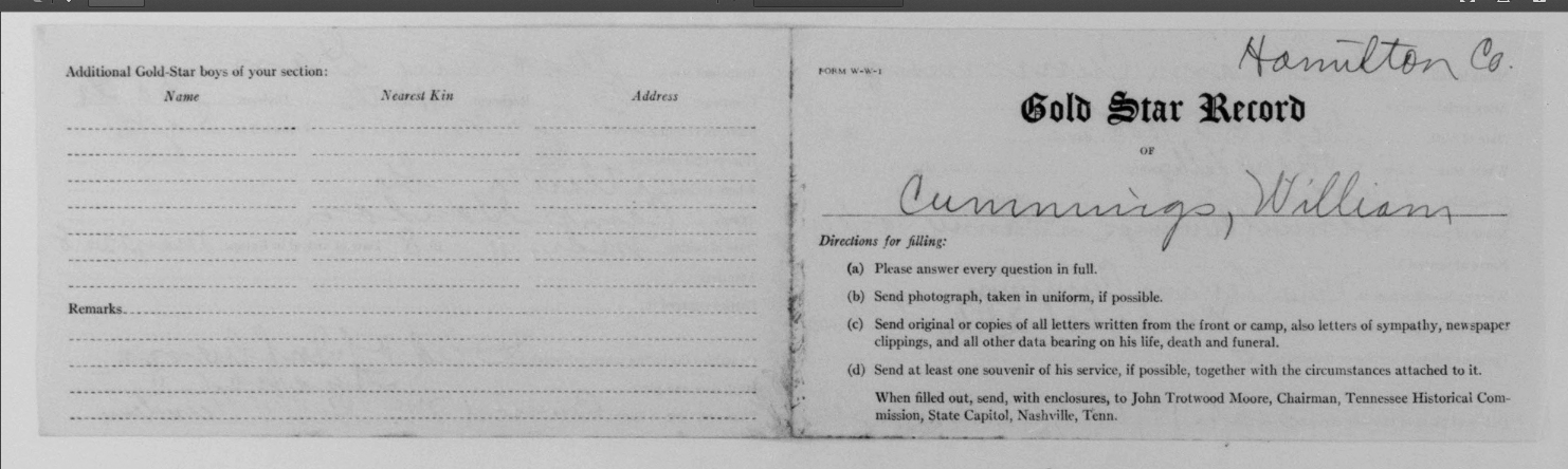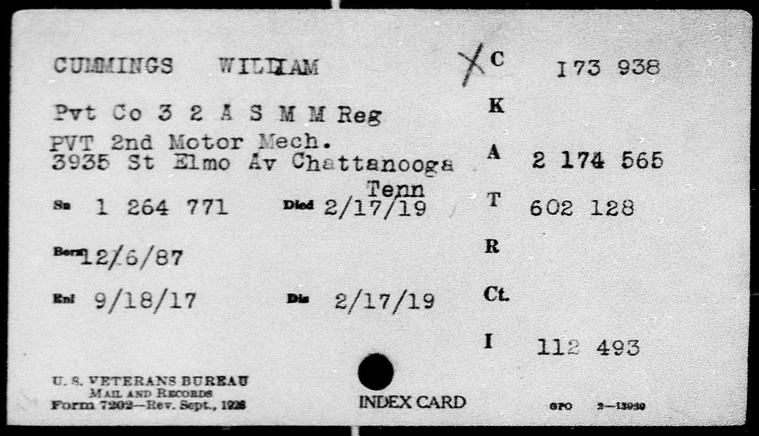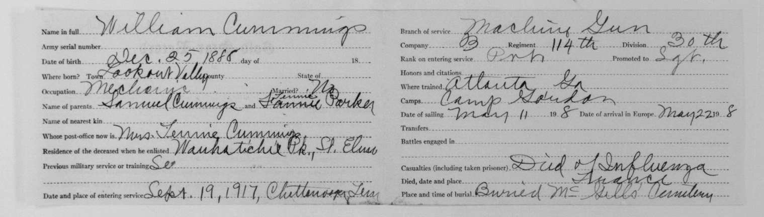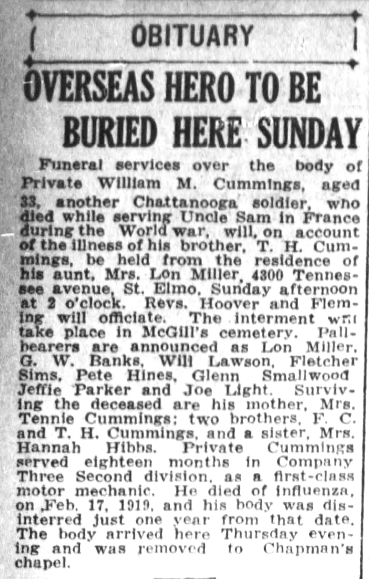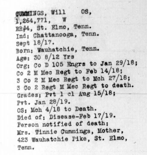 Will or William Cummings was born 6 December 1887, Wauhatchie, Tennessee to Samuel Cummings and Jennie Parker. He entered the service September 19, 1917 at Chattanooga and trained at Camp Gordon in Atlanta, Georgia. He sailed to Europe May 11, 1918, arriving on May 22. He died in France of influenza on 17 February 1919. Buried at McGill (also known as Magill) Cemetery.