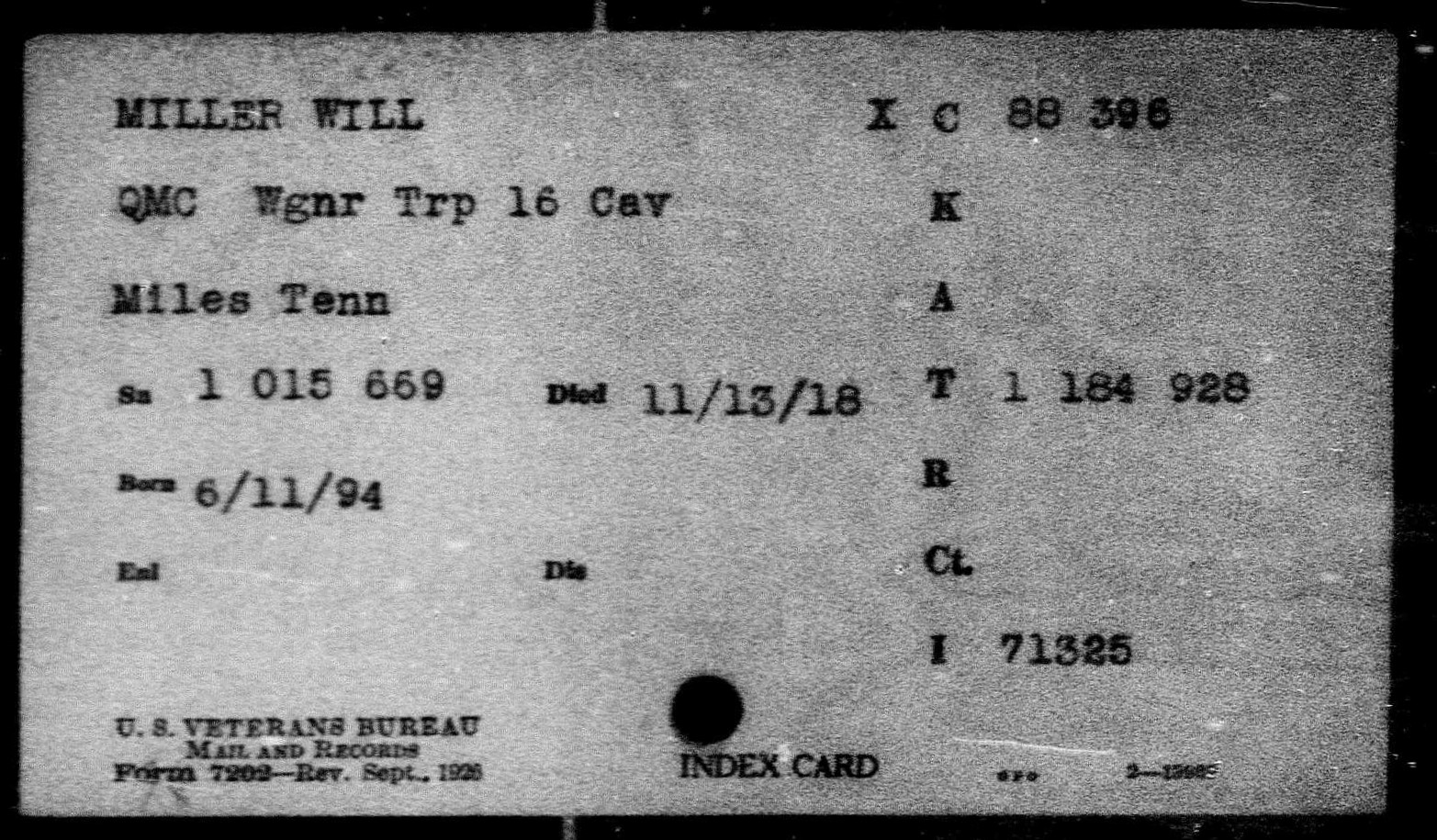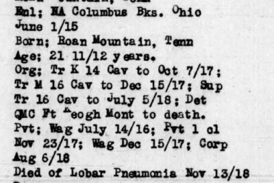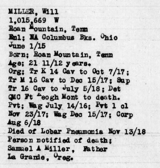 Will Miller was born in Roan Mountain, TN in 1894 and died November 13, 1918 (age 24) from non-hostile wounds/injuries (Lobar Pneumonia).