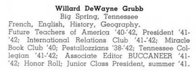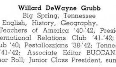 The parents, Mr. and Mrs. Dewey Grubb, Big Springs; sister, Mrs. George Castings Jr., of Cleveland and brother, Kenneth Grubb, U.S. Navy, New Orleans, La., also accompanied the body home. Pvt. Grubb graduated from Tennessee State College, Johnson City in 1942, and was a member of the faculty of Meigs County High School at Decatur during the school year 1942-1943. He was a member of Big Springs Christian Church and teacher in the Sunday School.