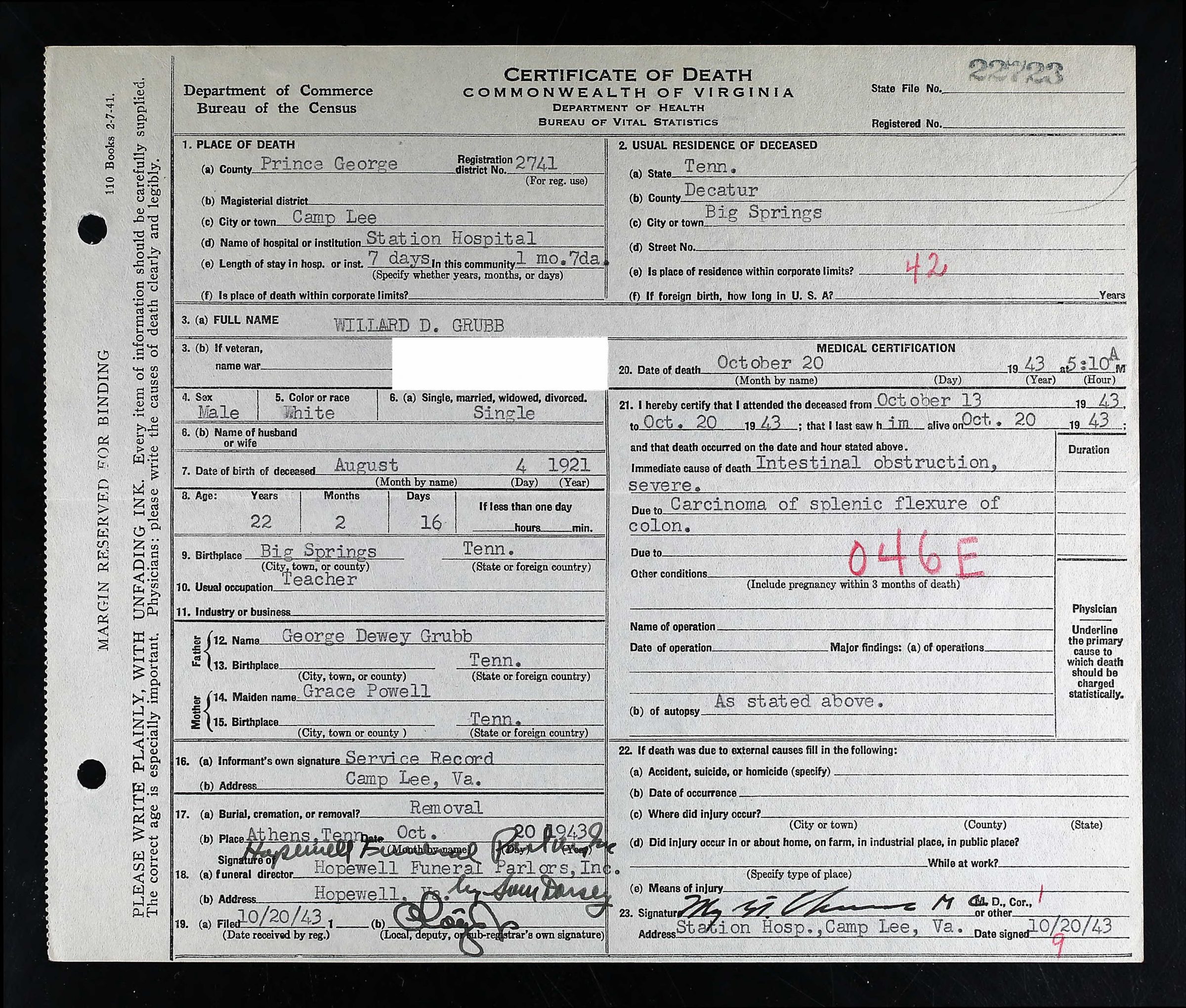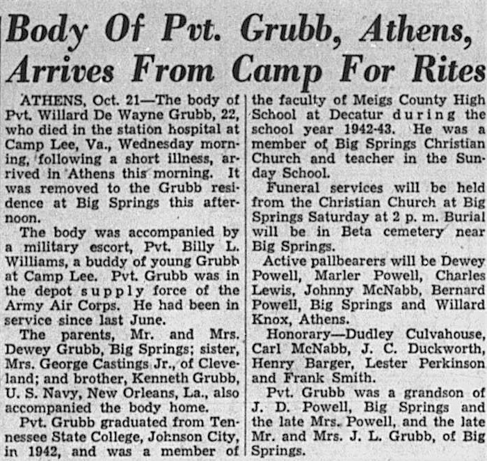 Athens, Oct. 21 – The body of Pvt. Willard De Wayne Grubb, 22, who died in the station hospital at Camp Lee, Va., Wednesday morning, following a short illness, arrived in Athens this morning. It was removed to the Grubb residence at Big Springs this afternoon. The body was accompanied by a military escort, Pvt. Billy L. Williams, a buddy of young Grubb at Camp Lee. Pvt. Grubb was in the depot supply force of the Army Air Corps. He had been in service since last June.