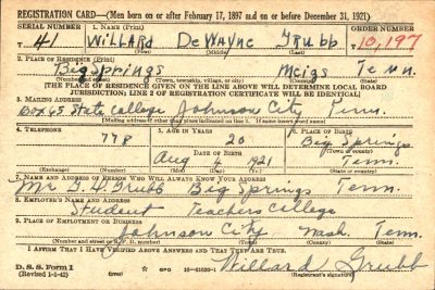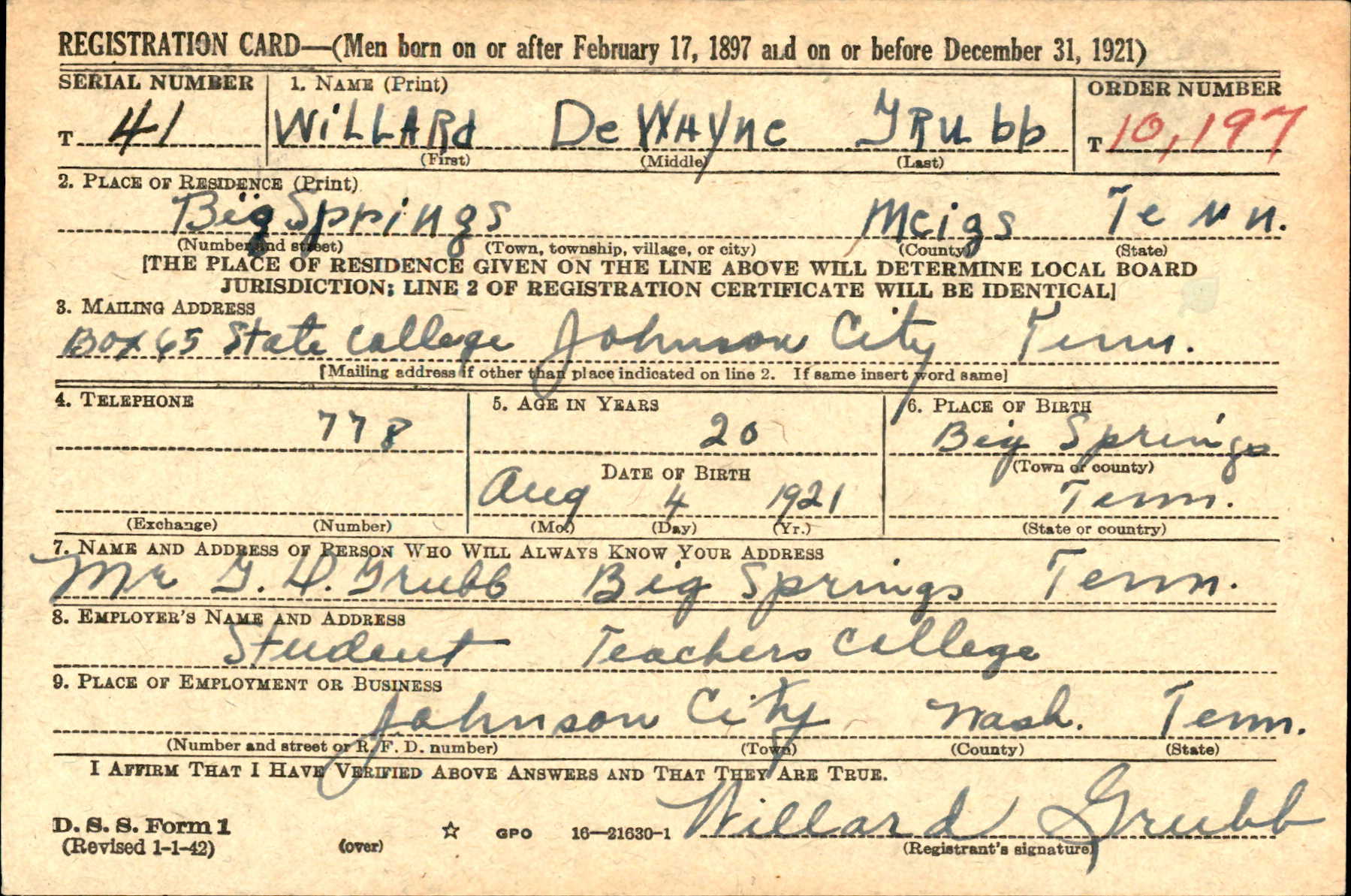 Willard DeWayne Grubb was born on 4 August 1921 in Meigs County, Tennessee to George Dewey Grubb and Grace Lee Powell.